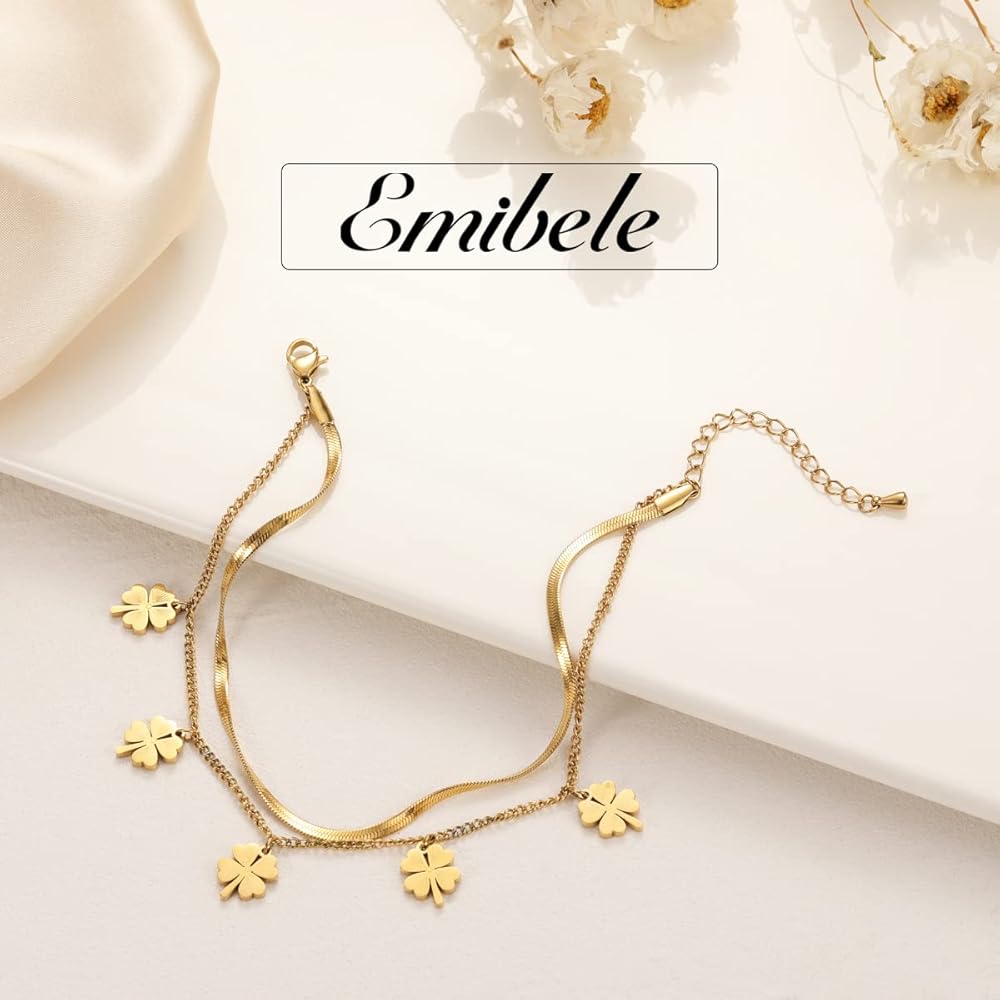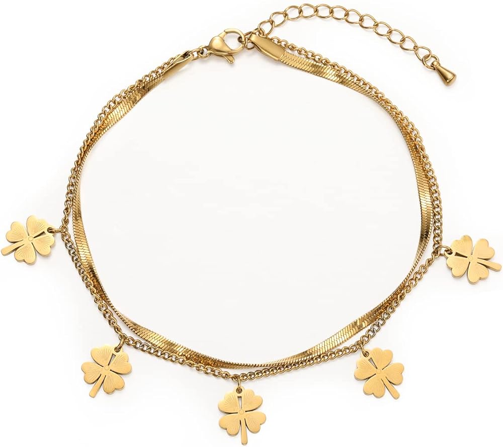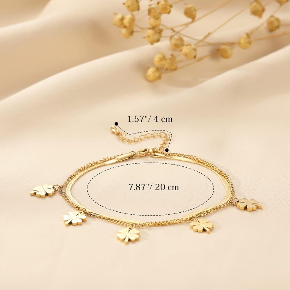 【Design Inspiration】Taking inspiration from the beauty of natural plants, this gold anklet is adorned with multiple delicate charms in the shape of four-leaf clovers. The four leaves represent faith, hope, love, and luck, bringing good luck and blessings to the wearer.
