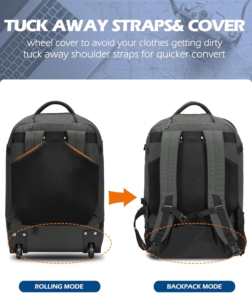 【Tuck Away Wheels Cover】weekender backpack is built with wheel cover to help avoid your clothes getting dirty when use it as a backpack, when you don't need to carry on your back, just tuck the cover into its zip pocket