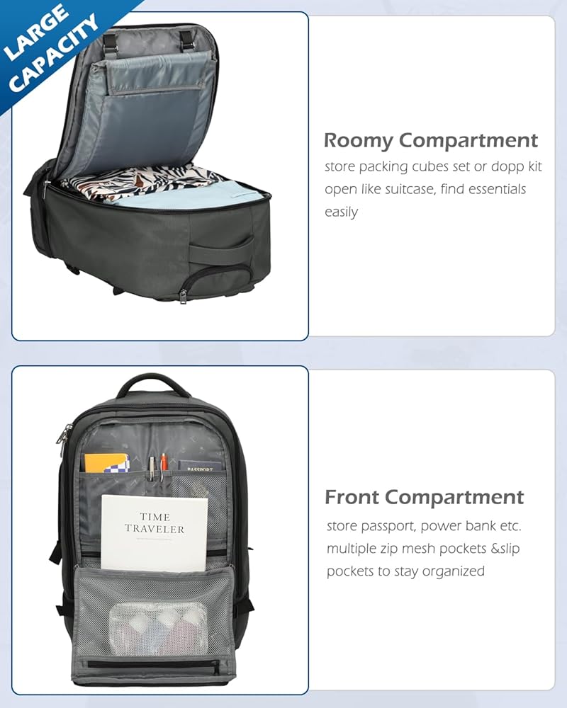 【Flight Approved Size】made of water repellent 900D polyester and 210D polyester lining, carry on bag which can fit in the allowed maximum size of most IATA flights and also fit in the overhead compartment, 42L carry on backpack Approx. Dimensions: 54 x 35 x 23 cm/ 21.3 x 13.8 x 9.0 inches, Approx. Weight: 4.96 lbs/ 2.25 kg;3 packing cubes set: Large+Medium+Small