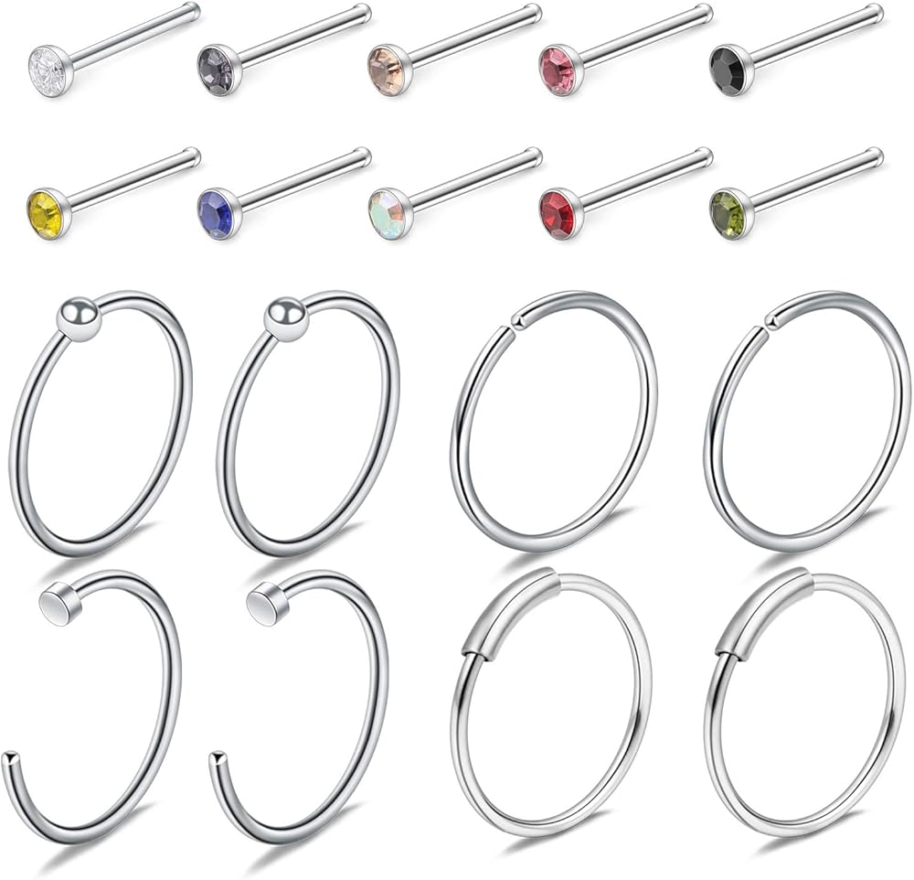 Size Details: 18PCS Nose Hoop Rings 22 Gauge(0.6mm),Inner Diameters are 1/4"(6mm),5/16"(8mm) and 3/8"(10mm); 60PCS Nose Studs 22G(0.6mm), Bar Length About 6.5mm, Cubic Zirconia Size are 2mm.