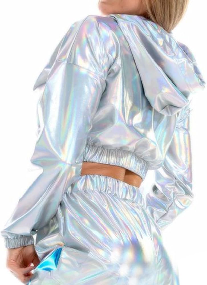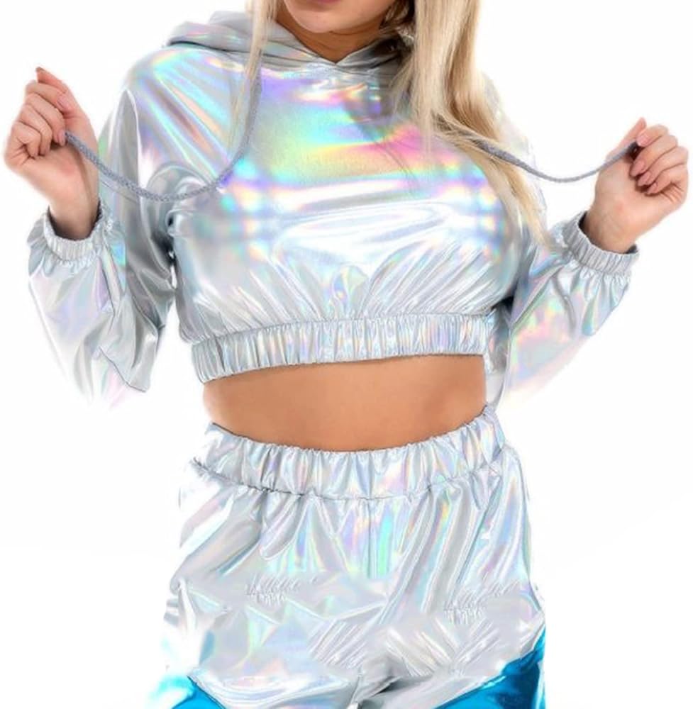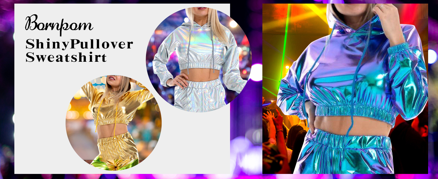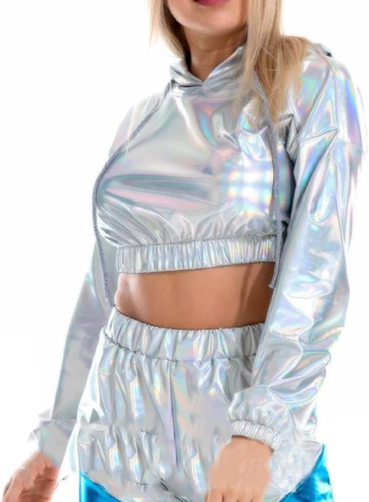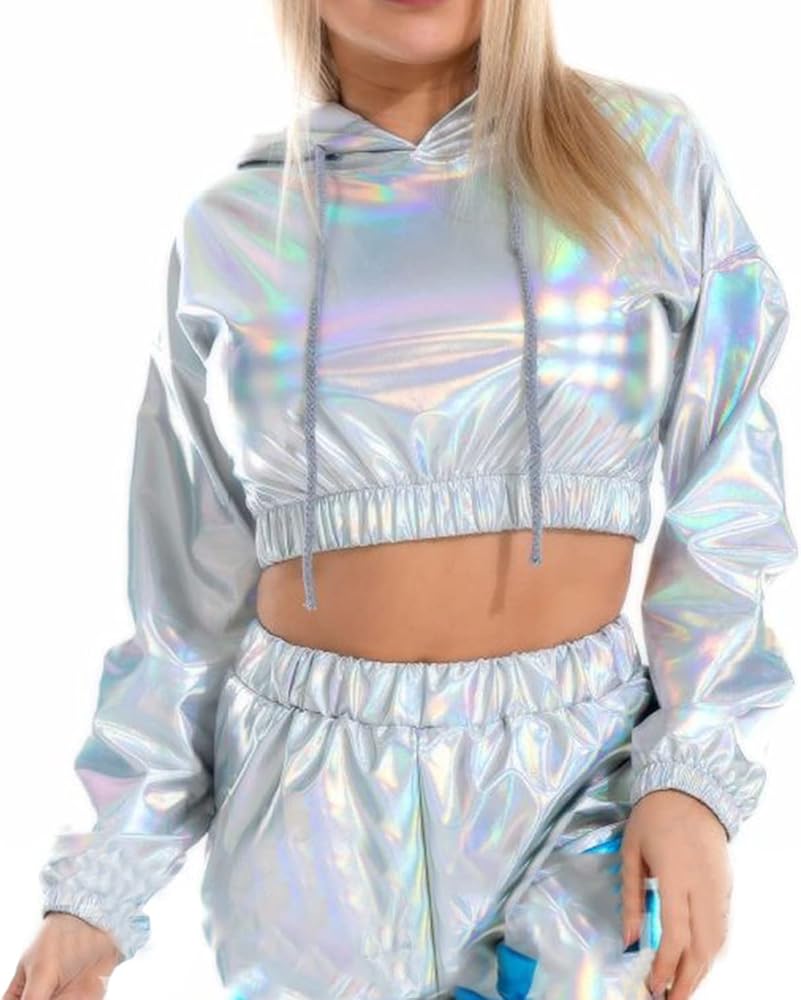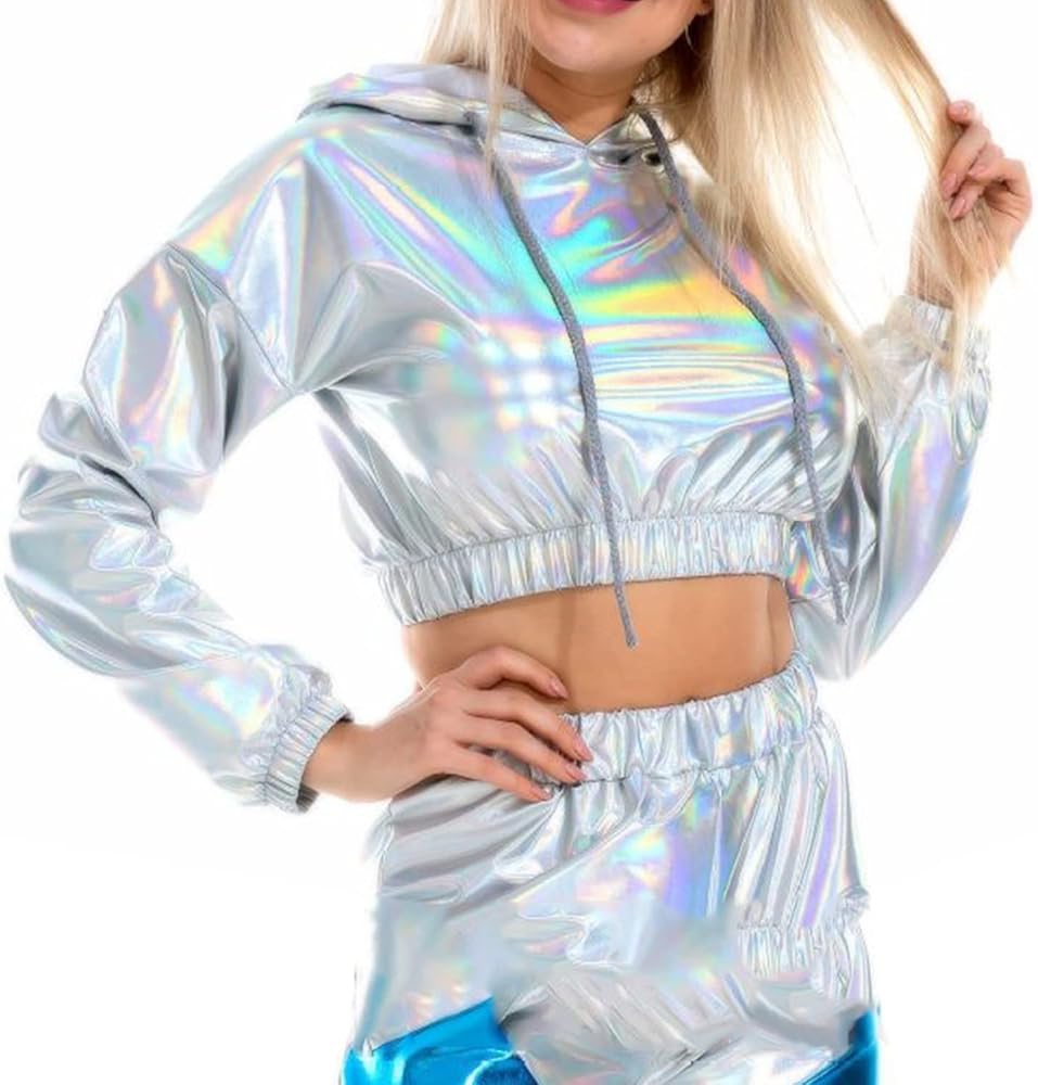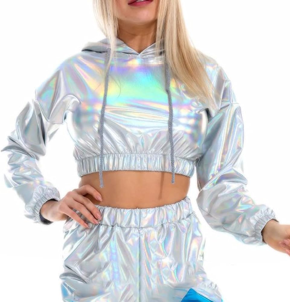 【بلوزة قصيرة لامعة】بلوزة قصيرة بأكمام طويلة معدنية لامعة للسيدات، سويت شيرت كاجوال بأكمام طويلة وغطاء للرأس برباط، بلوفر فضفاض ثلاثي الأبعاد على شكل هيب هوب، ملابس نادي الشارع. مستوحاة من ملابس السبعينيات والثمانينيات والتسعينيات. هذه السترات الرائعة المصنوعة من البولي يوريثين ثلاثية الأبعاد مناسبة جدًا لملابس الحفلات الراقصة.