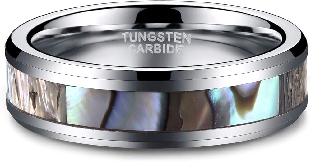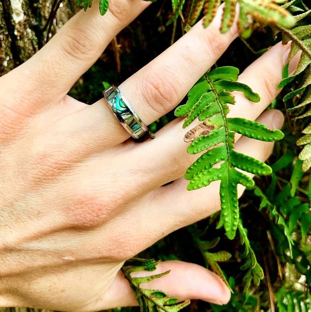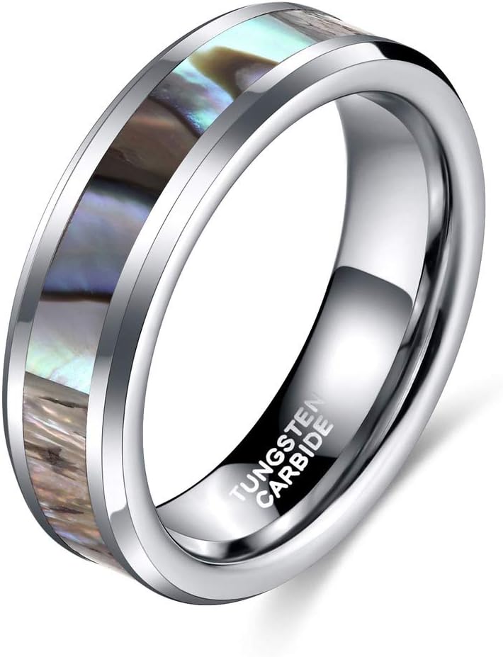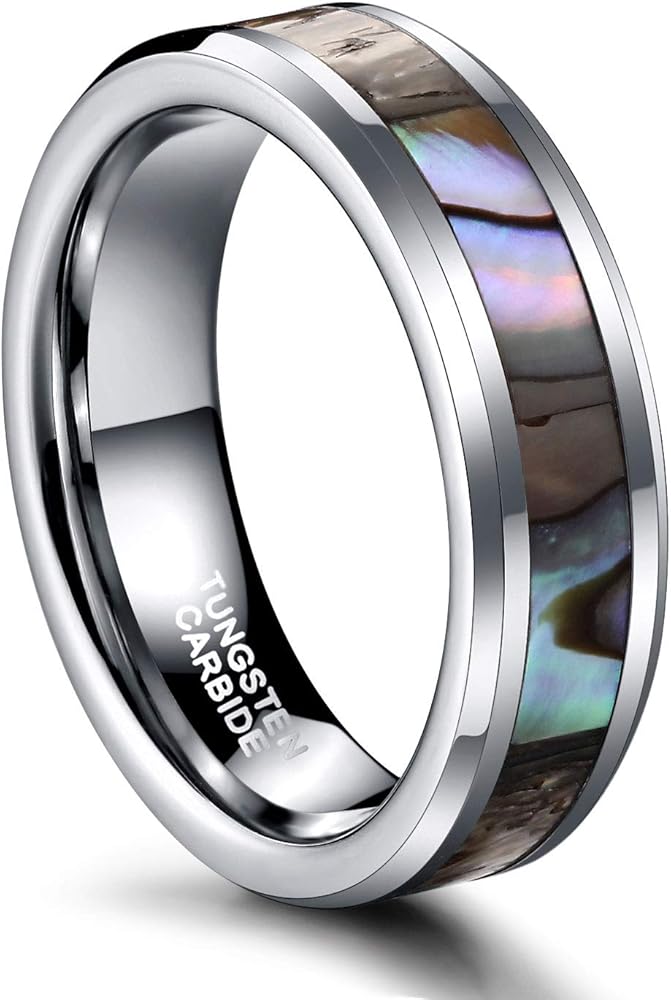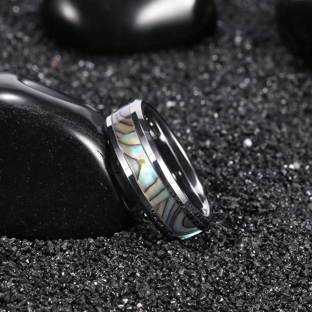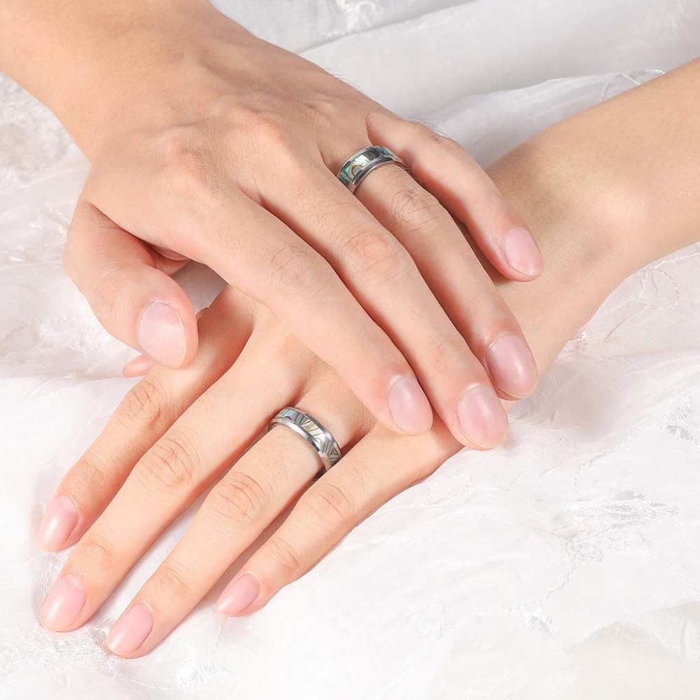 - التصميم: خواتم زفاف 6 مم 8 مم للرجال والنساء. صدفة أذن البحر مرصعة بالأوبال، حواف مشطوفة، قبة، مصقولة بدرجة عالية