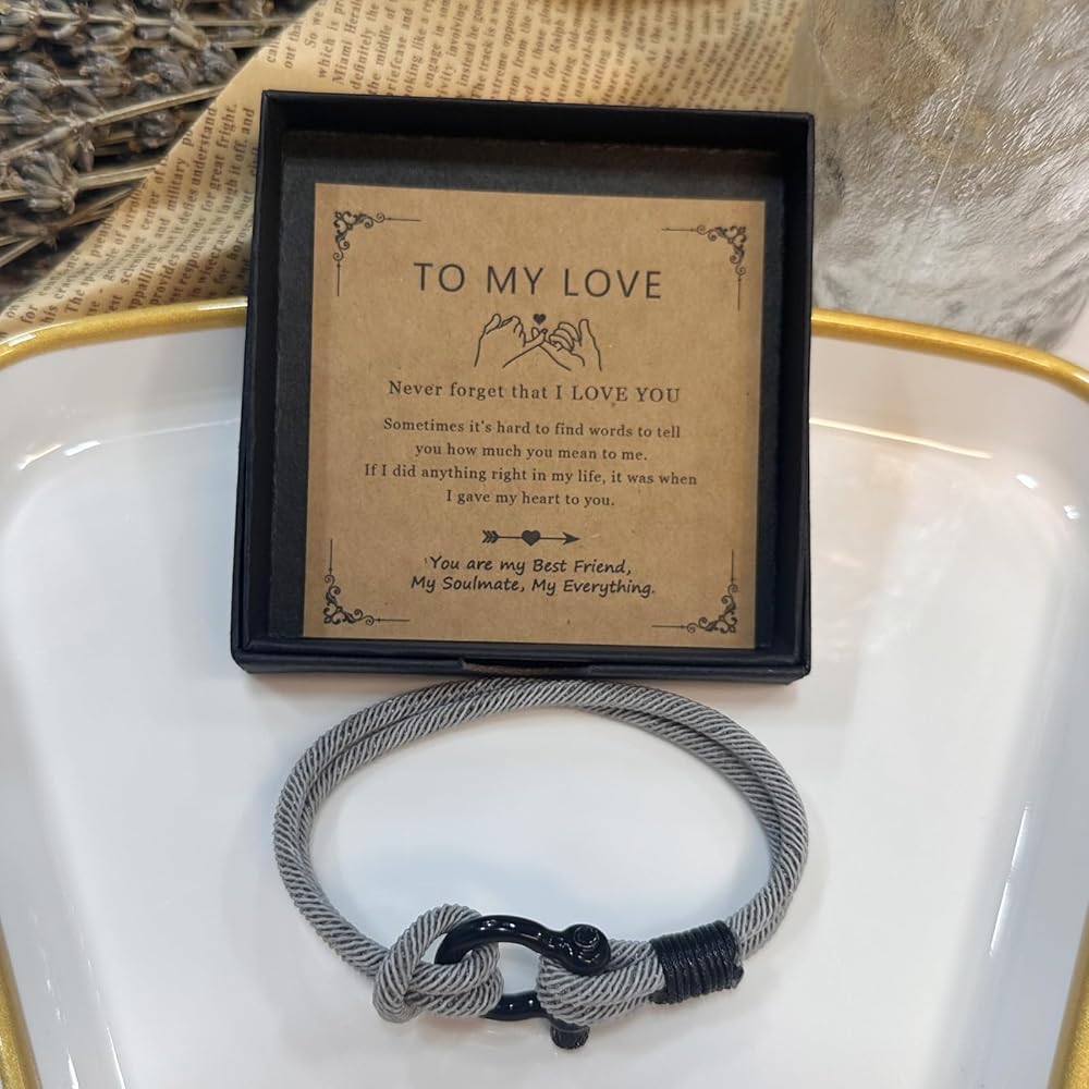 [أساور بحرية للرجال]: يتميز سوار الحبل بتصميم بسيط، مكمل ببطاقة رسالة من القلب تعبر عن الحب والرعاية. فاجئ من تحب برسالة "أحبك إلى الأبد"، مما يضمن حصوله على حبك وبركاتك أينما ذهب. هذا السوار الرجالي المصنوع من الحبال هو الطريقة المثالية لنقل حبك إلى أحبائك الأعزاء.