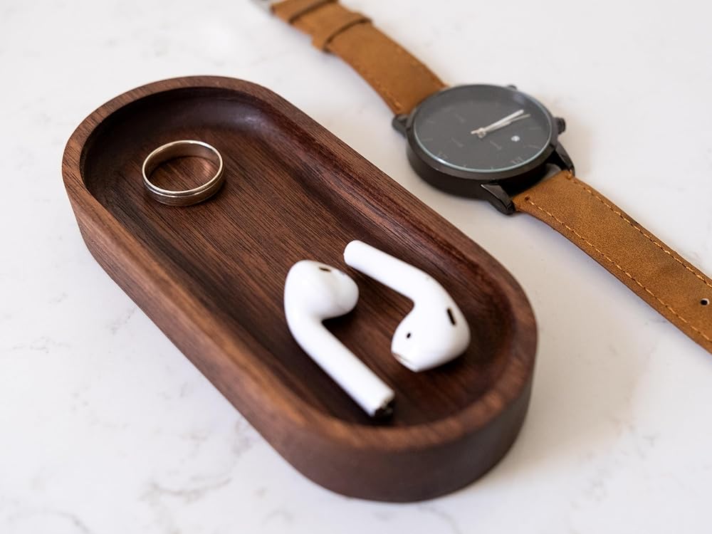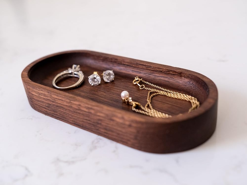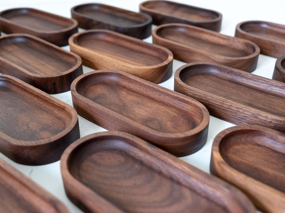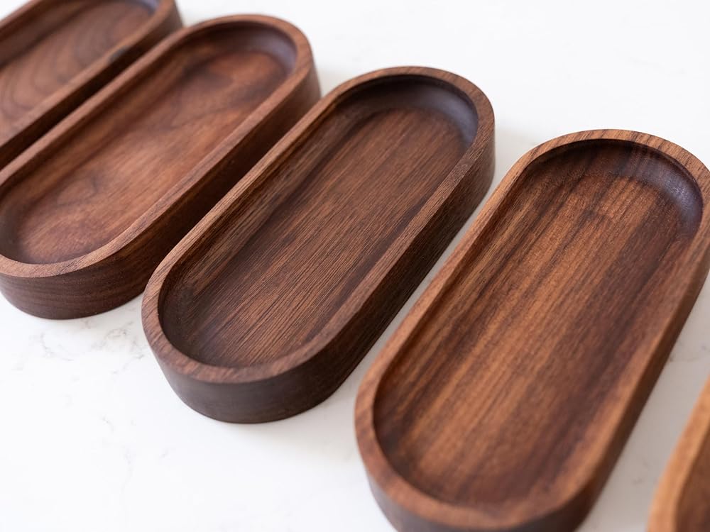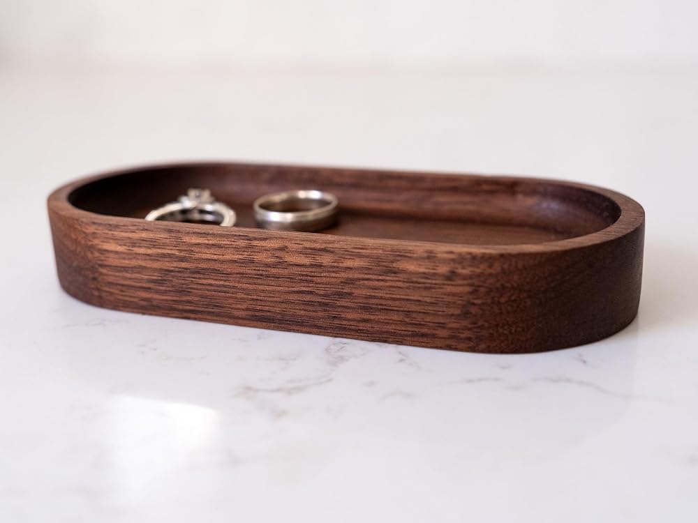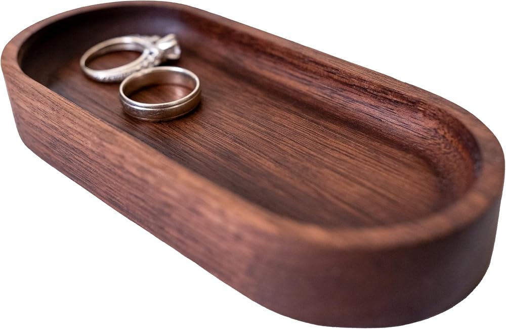 Made from premium black walnut wood, these versatile trays provide a simple elegant solution for keeping your valuables safe. Ideal for storing rings, jewelry, or other small items. Designed and crafted locally in the USA from start to finish. They are finished with tung oil and polyurethane for a natural feeling wood finish with longer lasting protection. Due to the handcrafted nature of this product and individual characteristics of the wood, please allow for differences in wood grain, knots, tone, and slight variances in dimensions. Approximate outer dimensions: 5.5" x 2.5" x 0.75"