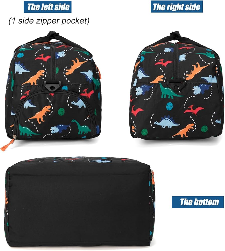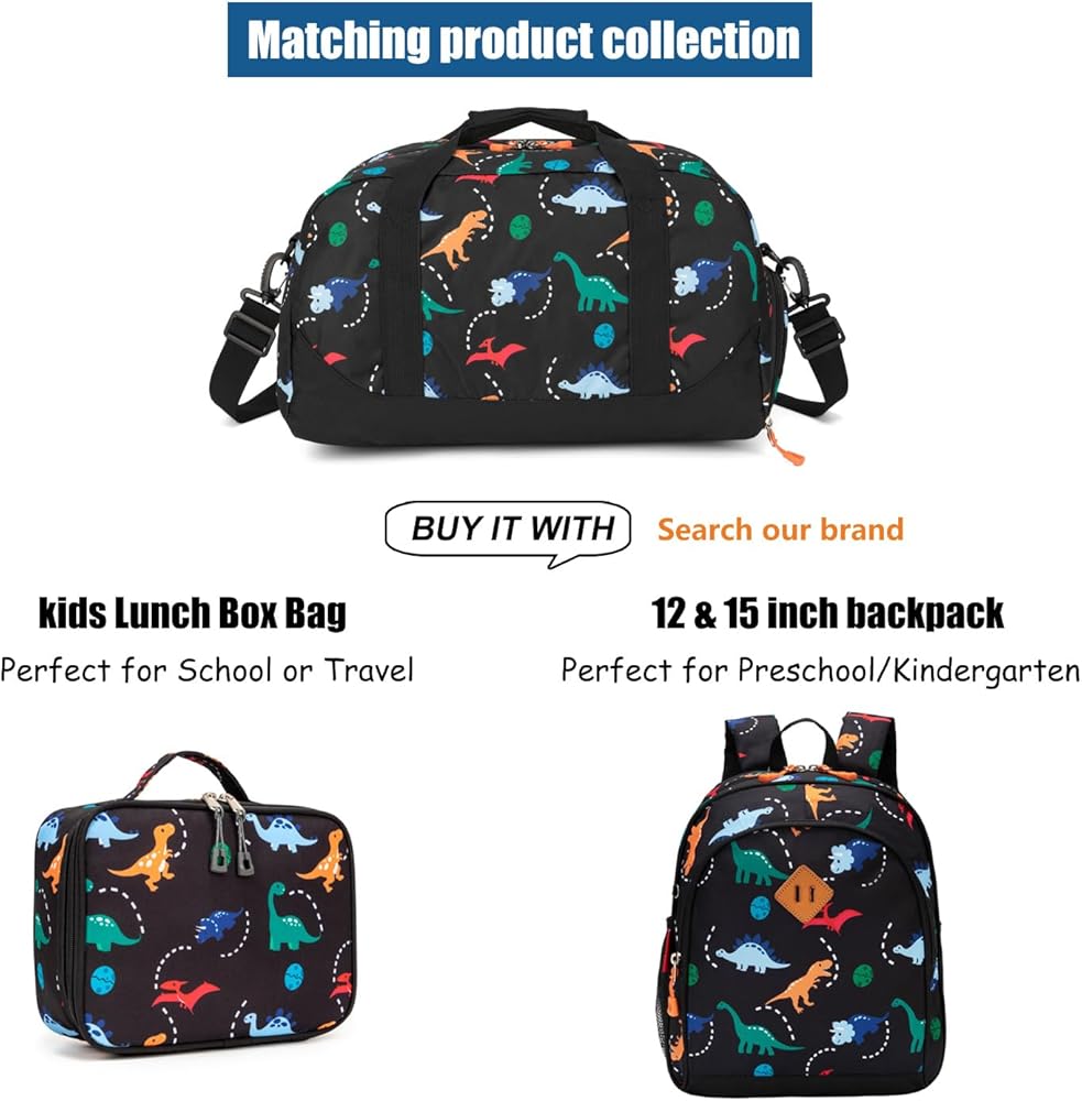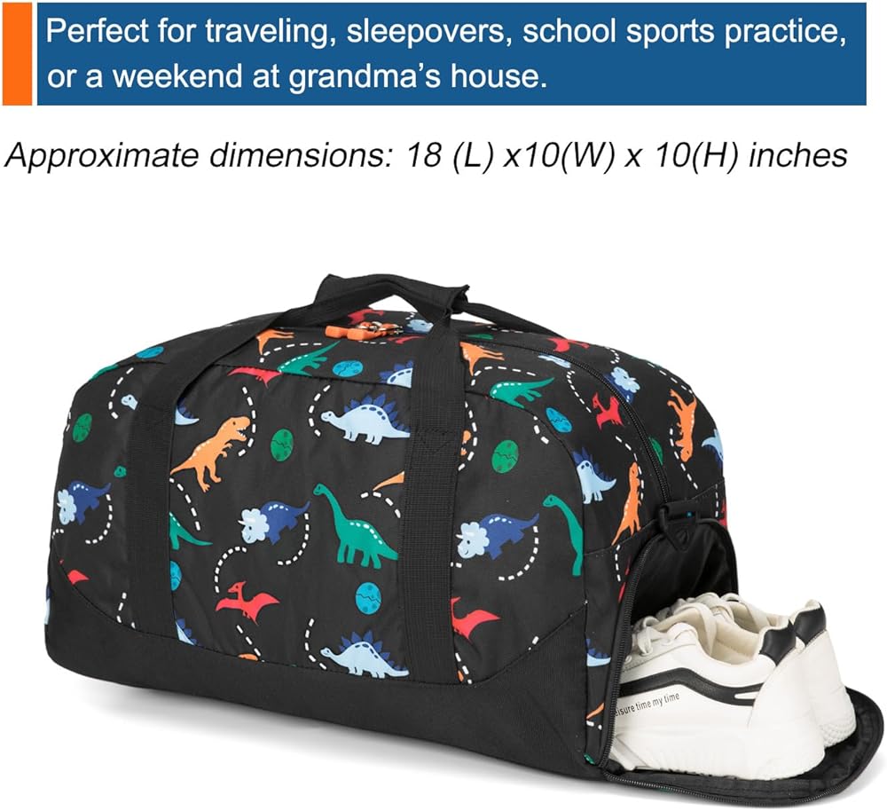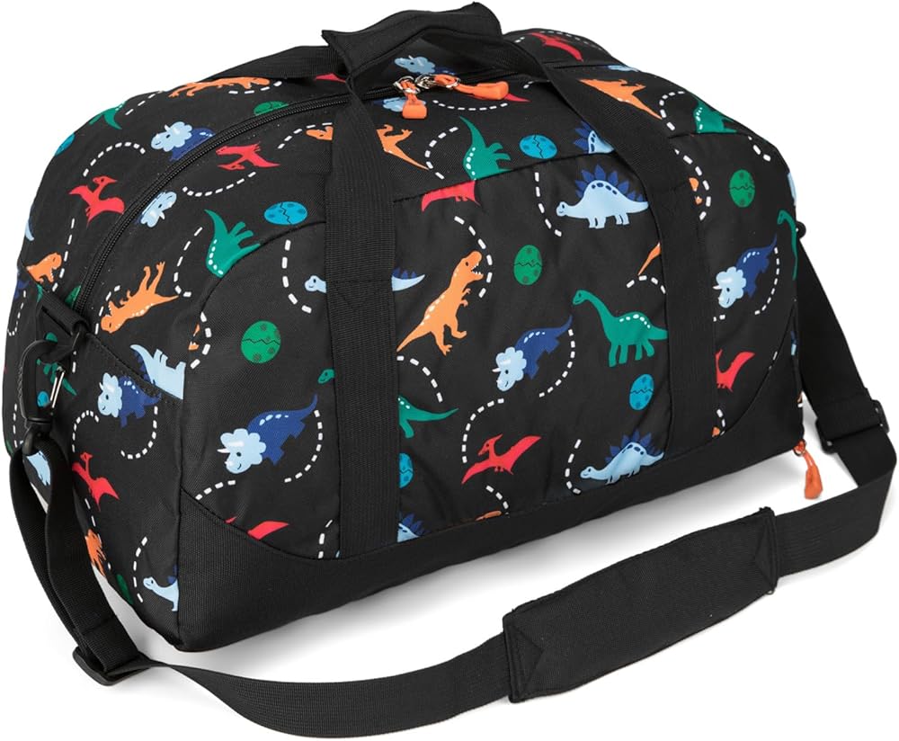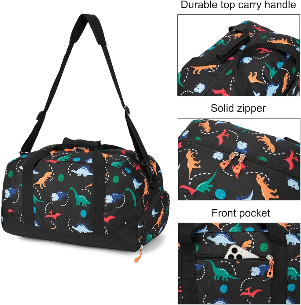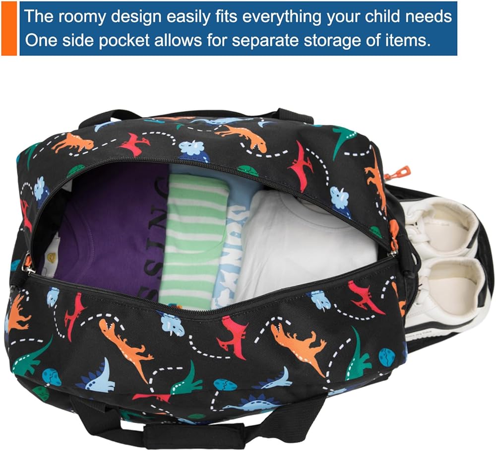Fits 3+ years old kids boys. Measuring 18 x 10 x 10 inches, this children's duffle bag's roomy design easily fits everything your kids need. It is lightweight enough to ensure your kids don't get weighed down. Featuring colorful dinosaur patterns, your child will love it as part of travel or school gear.