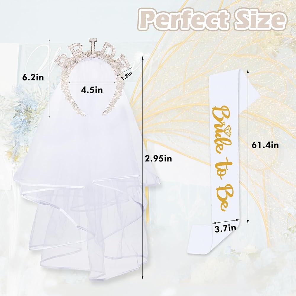 مقاسات مجموعة حفلات توديع العزوبية للعروس: يبلغ مقاس طوق الشعر اللؤلؤي 8.2 × 8.2 انش وطول الوشاح المتصل بشريط الرأس حوالي 29.5 انش. مقاس الوشاح 61.4 × 3.7 انش.