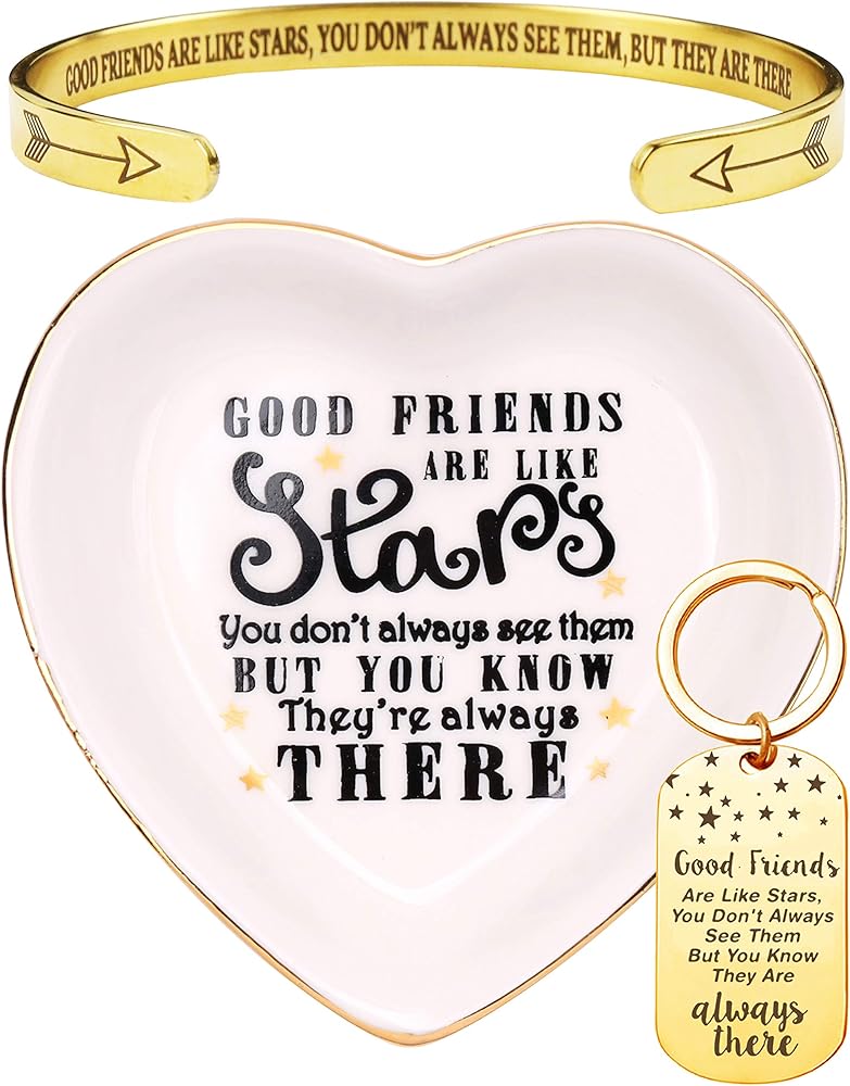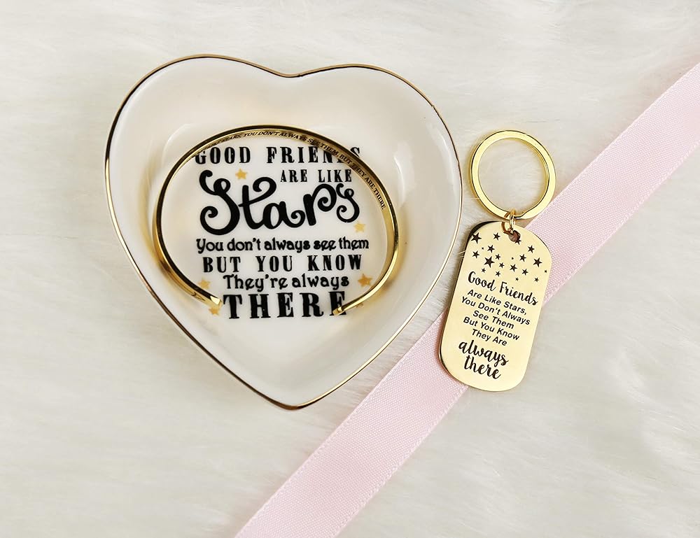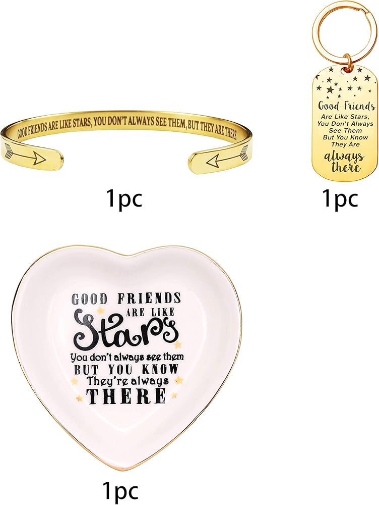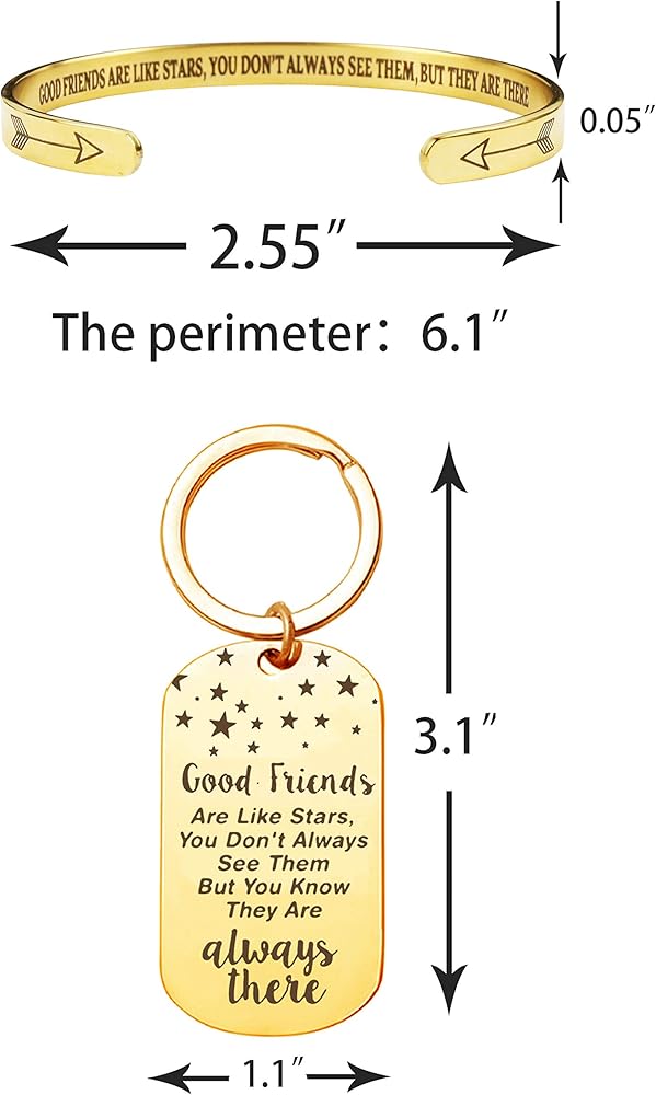 سلسلة مفاتيح "الأصدقاء الجيدون مثل النجوم": تتضمن مجموعة هدايا أفضل الأصدقاء هدية واحدة لسلاسل مفاتيح الأصدقاء المقربين "منقوشة بمقولات "الأصدقاء الجيدون مثل النجوم، لا تراهم دائمًا ولكنك تعلم أنهم موجودون دائمًا"، هدية مثالية لأفضل صديق ، هدايا عيد ميلاد للأصدقاء الإناث، أفضل هدايا الأصدقاء للنساء مضحكة.