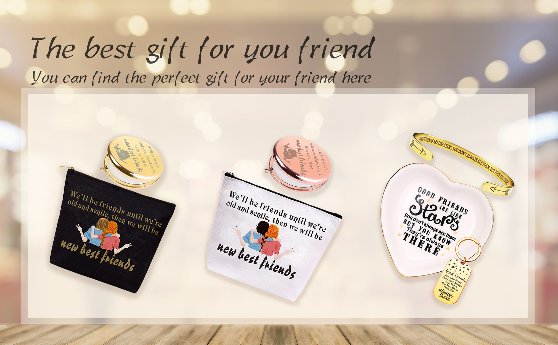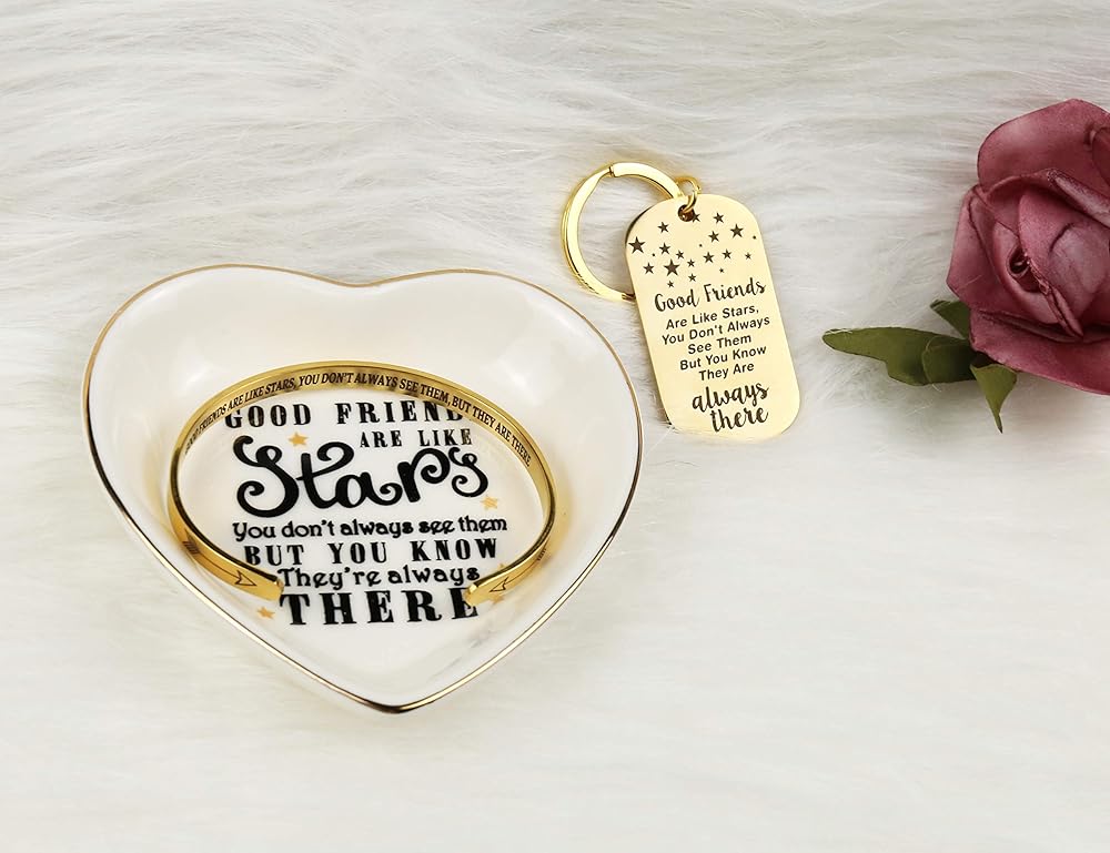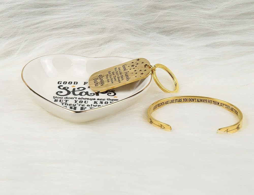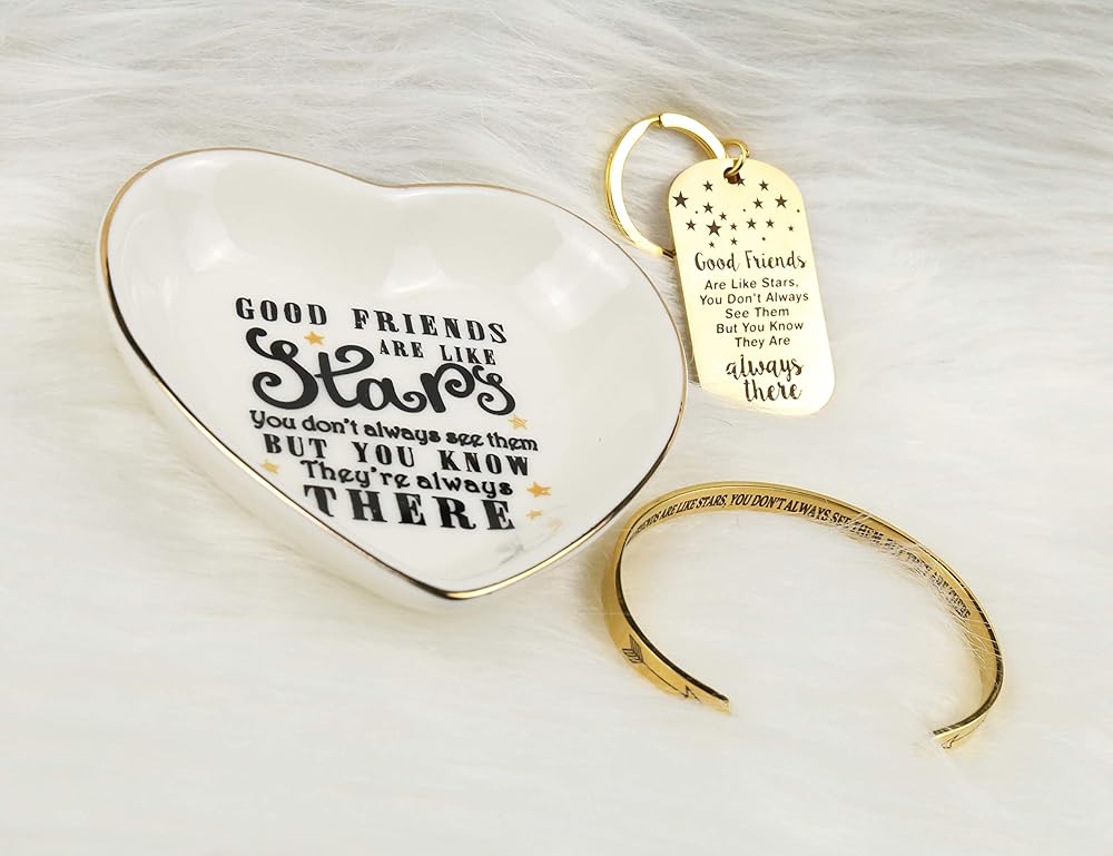 سلسلة مفاتيح "الأصدقاء الجيدون مثل النجوم": تتضمن مجموعة هدايا أفضل الأصدقاء هدية واحدة لسلاسل مفاتيح الأصدقاء المقربين "منقوشة بمقولات "الأصدقاء الجيدون مثل النجوم، لا تراهم دائمًا ولكنك تعلم أنهم موجودون دائمًا"، هدية مثالية لأفضل صديق ، هدايا عيد ميلاد للأصدقاء الإناث، أفضل هدايا الأصدقاء للنساء مضحكة.