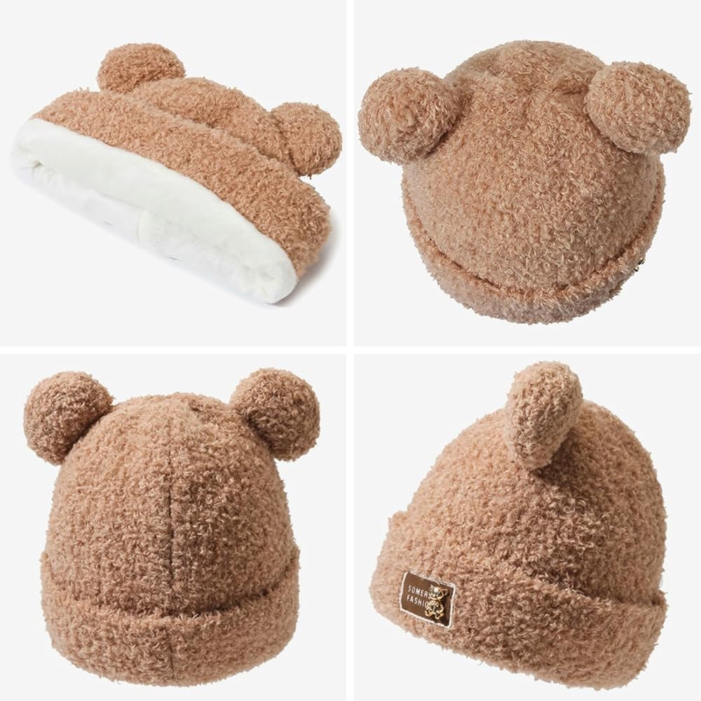 Women's Cute Fuzzy Bear Ear Beanie Hat Skin-Friendly Warm Plush Knitted Hat Winter Animal Skull Cap