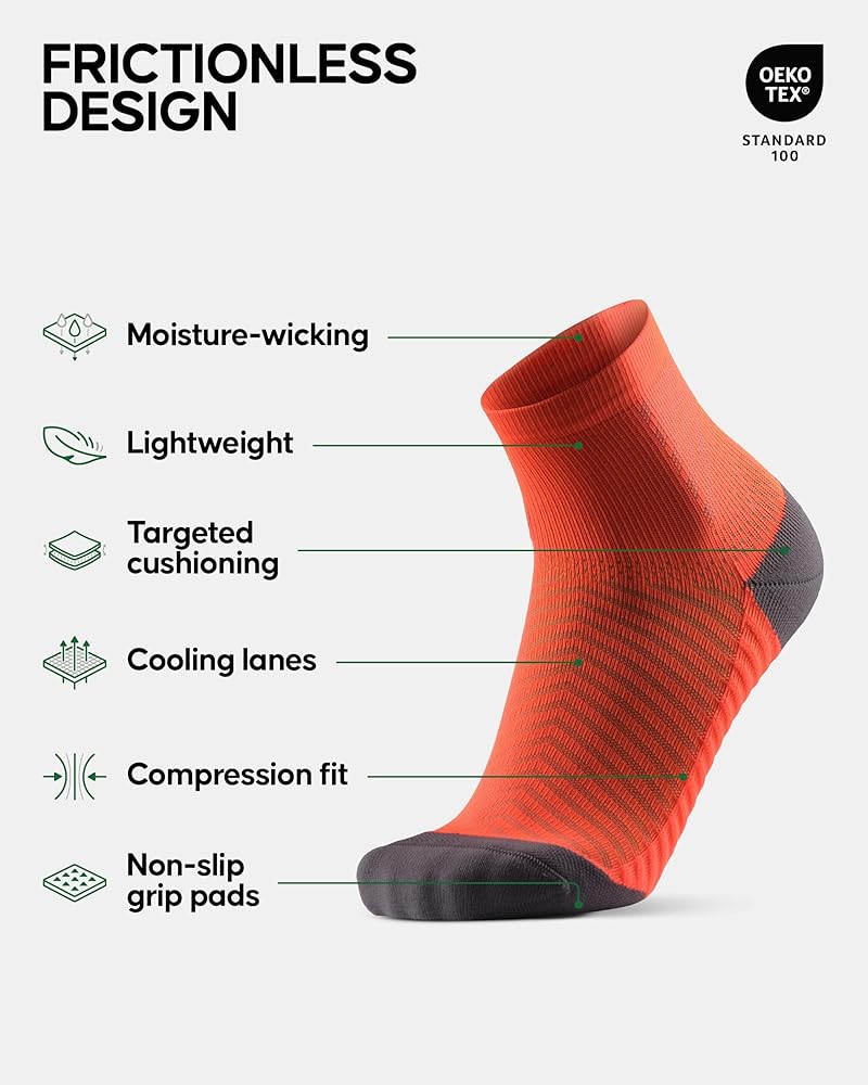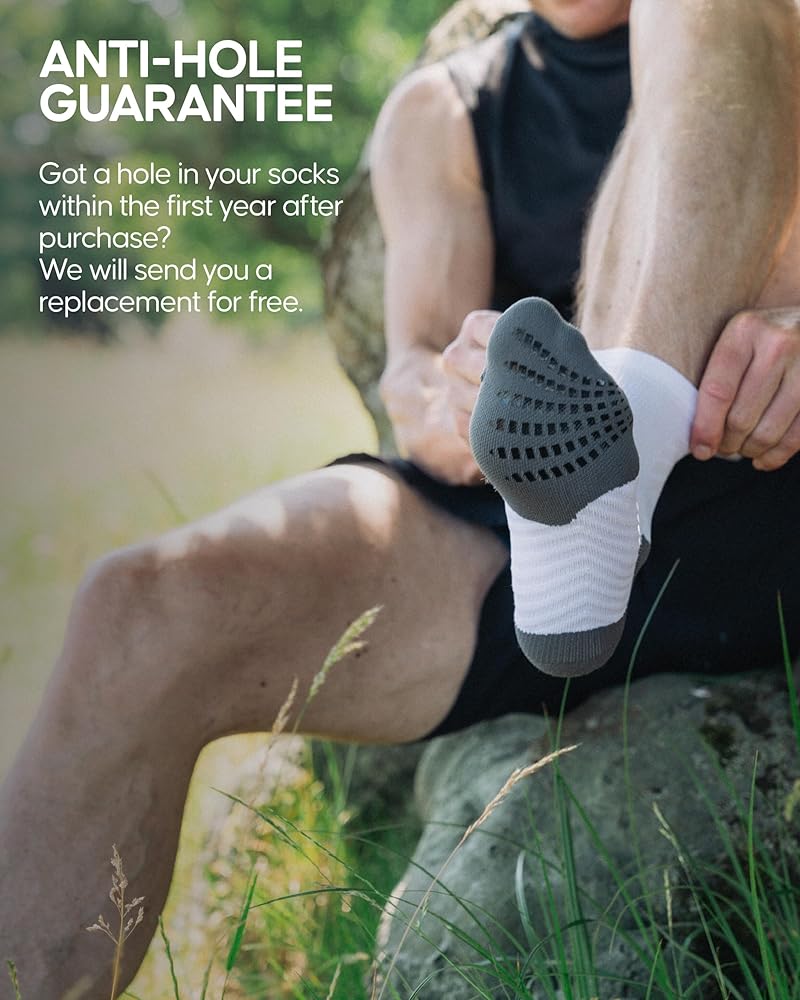 تعمل وسادات المقبض غير القابلة للانزلاق في جوارب السباق الخاصة بنا على زيادة التلامس مع حذائك من أجل الجري والسباقات الخالية من البثور. بطانة على أصابع القدم والكعب والكاحل تحمي قدميك على جميع التضاريس