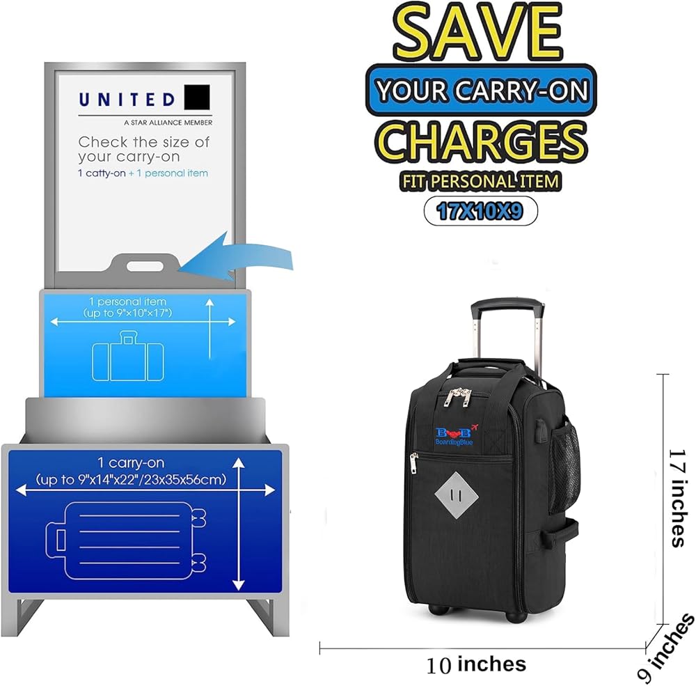 Specially designed for Basic Economy on United Airlines. __ Bag sizes 17"10"9" which is custom made following the airline's restriction and fits perfectly the front space.__ 3.08lb Lightweight (SIZE INCLUDING WHEELS AND HANDLE)