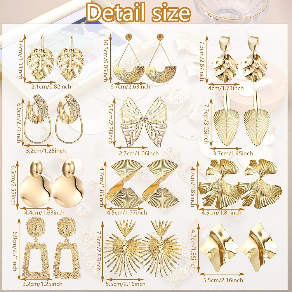 【Exaggerated Earrings Design】The whole statement earring set is relatively exaggerated and luxurious. Gold earrings sizes are different for different designs, please refer to the size chart for the exact size of the geometric earrings.Exaggerated earrings can be a great way to add your highlights for your appearance, make you more unique and attractive in the crowd.