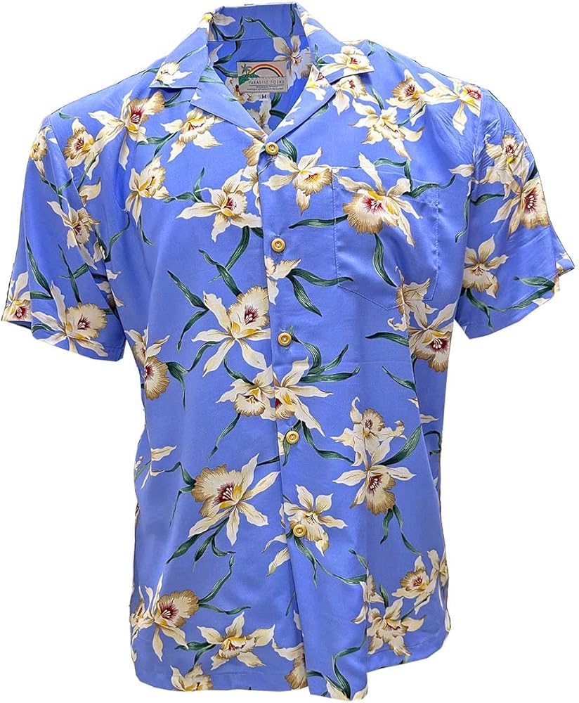 بارادايس فاوند قميص هاواي للرجال - ستار اوركيد نافي | 100% رايون بازرار لاسفل، صنع في هاواي، ملابس شاطئ الوها الصيفية in Kuwait