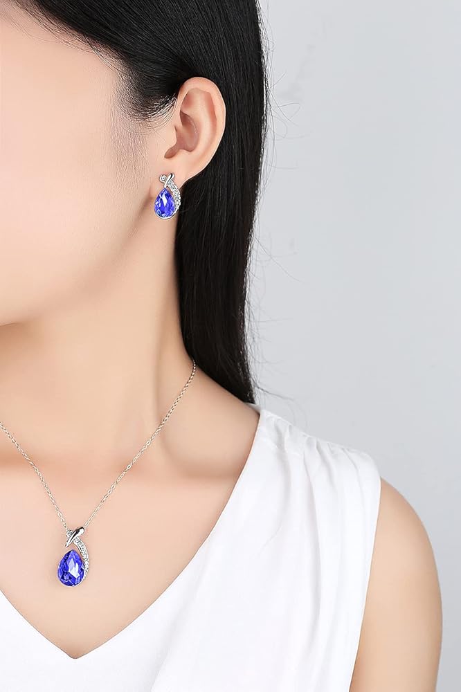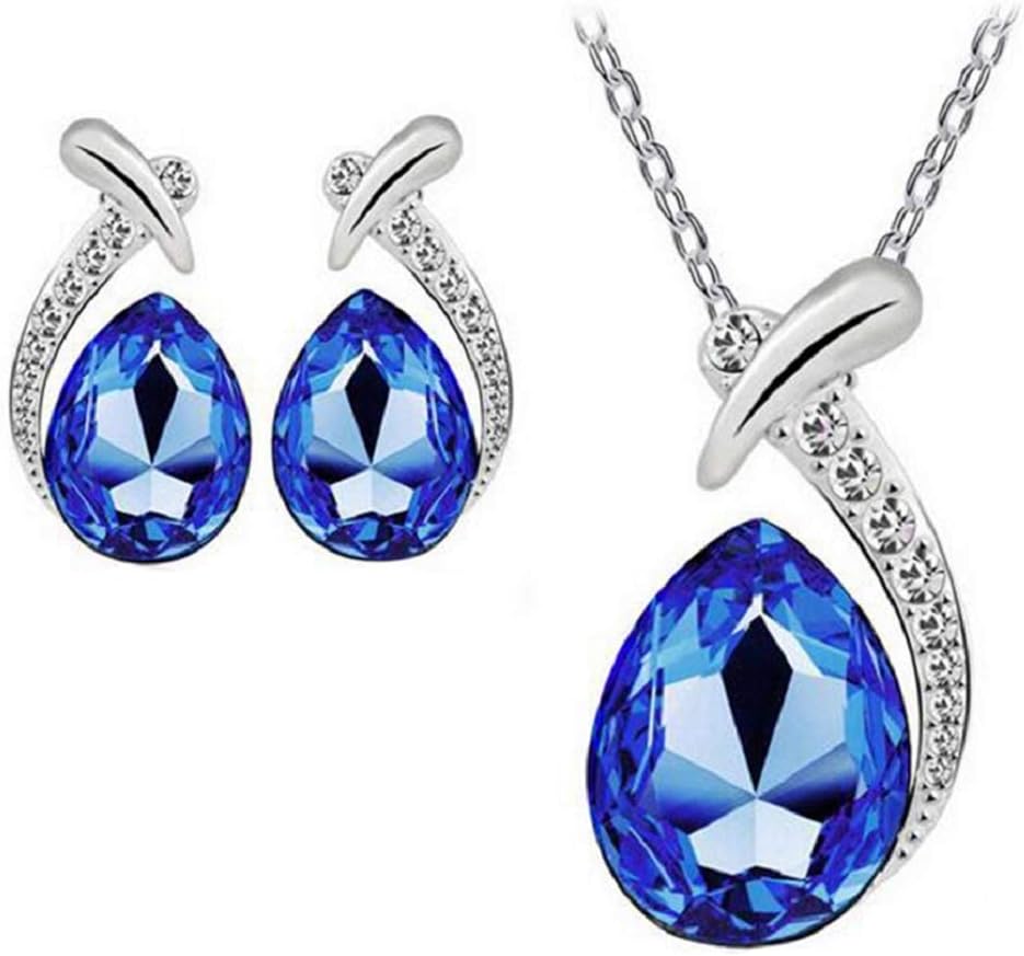 هارلوركي مجموعة قلادة واقراط من حجر الراين الكريستالي على شكل دمعة - مجوهرات لامعة مع احجار زرقاء ملكية، مثالية للازياء التنكرية والازياء - هدية رائعة للنساء والفتيات، مقاس S، من الستانلس ستيل