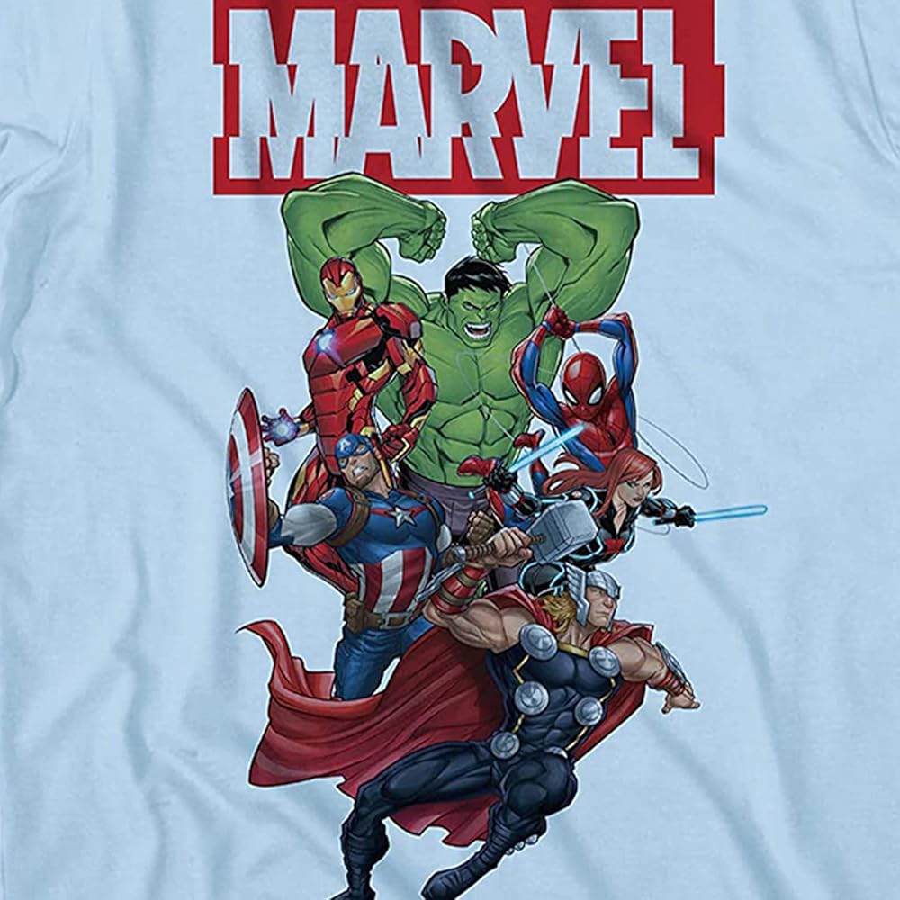 أعيدي تلك الذكريات مع هذا القميص من مجموعة مارفيل كوميكس الذي يتميز بما يلي: سبايدر مان وكابتن أمريكا وايرن مان وهالك.