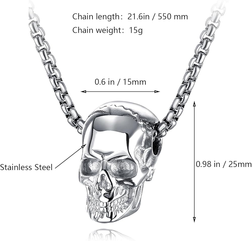 • Size: the skull pendant is 0.59 inches long and 0.98 inches wide, and the necklace chain is 21.65 inches long with a flexible lobster clasp. The chain and pendant total 25 grams.