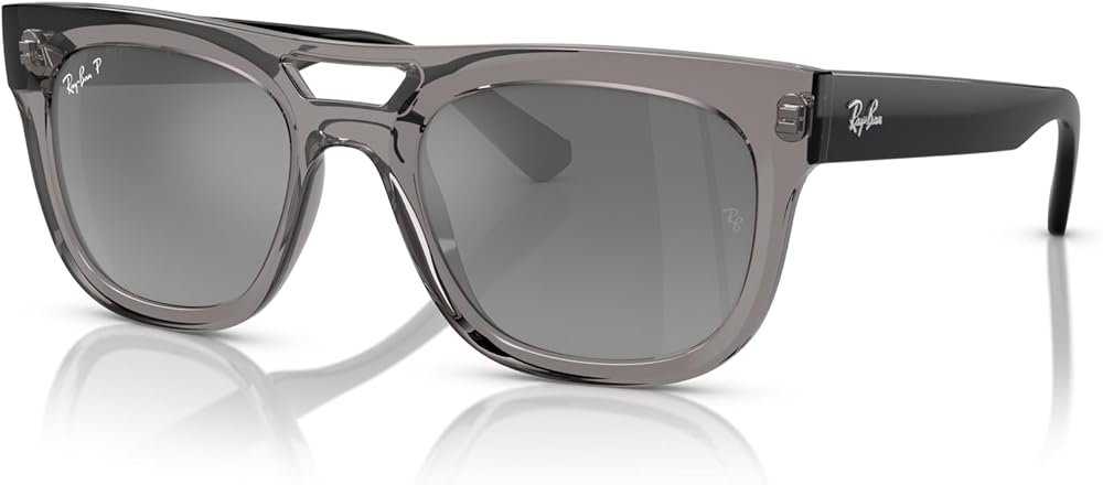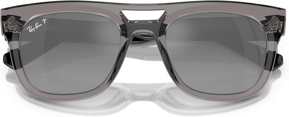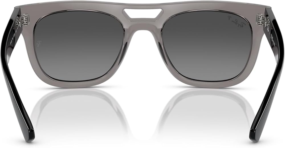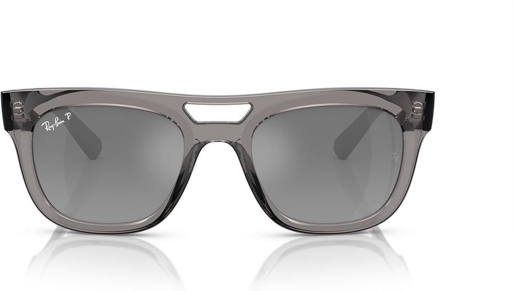 FRAME FEATURES: RB4426 Phil sunglasses feature a square, transparent frame with a cut-out bridge and grey gradient silver mirrored polarized lenses. Made with sustainable bio-acetate frame material.