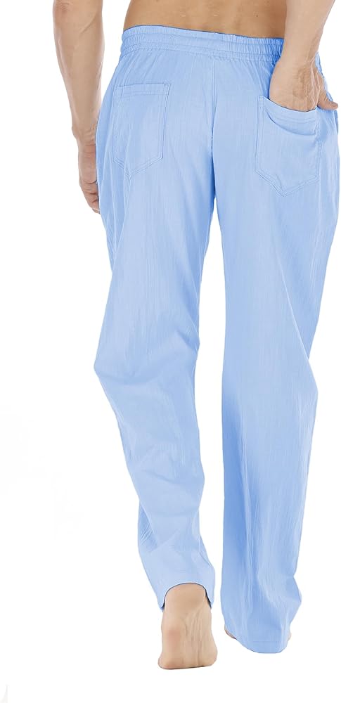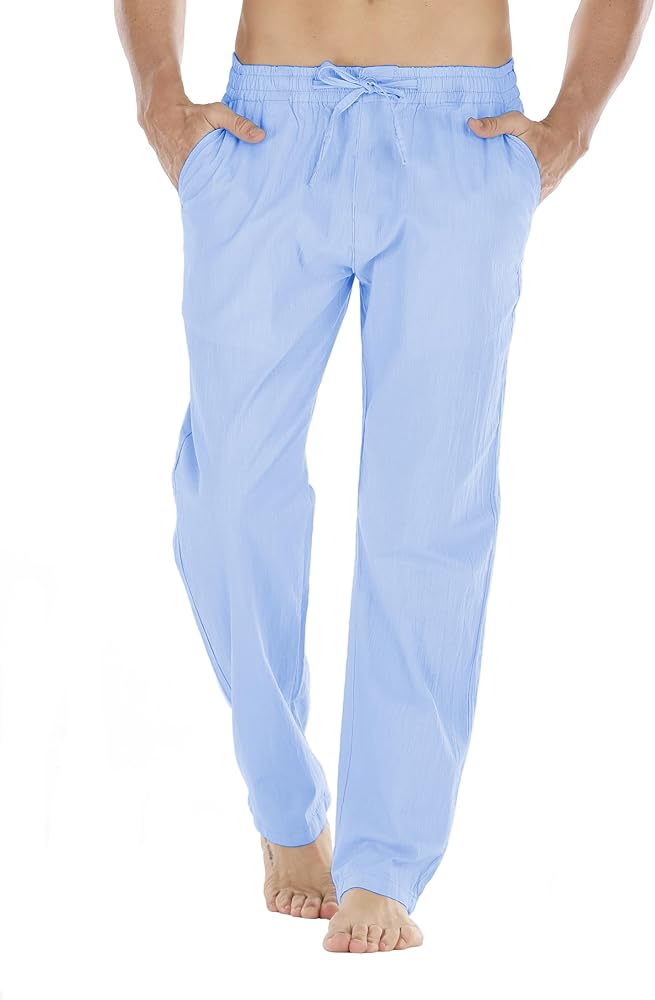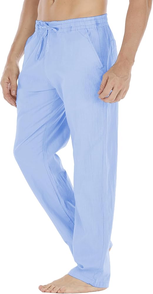 سراويل Durzasvo الرجالية خفيفة الوزن مقاومة للانكماش من الكتان كاجوال صيفية برباط خصر مرن من الكتان للشاطئ أزرق فاتح L