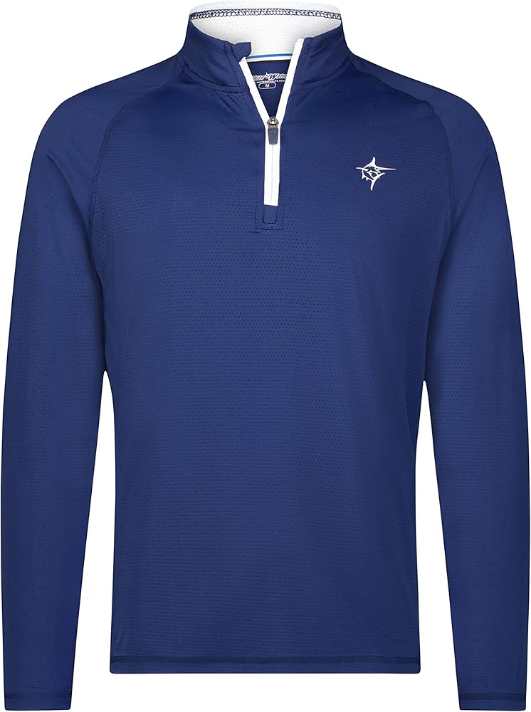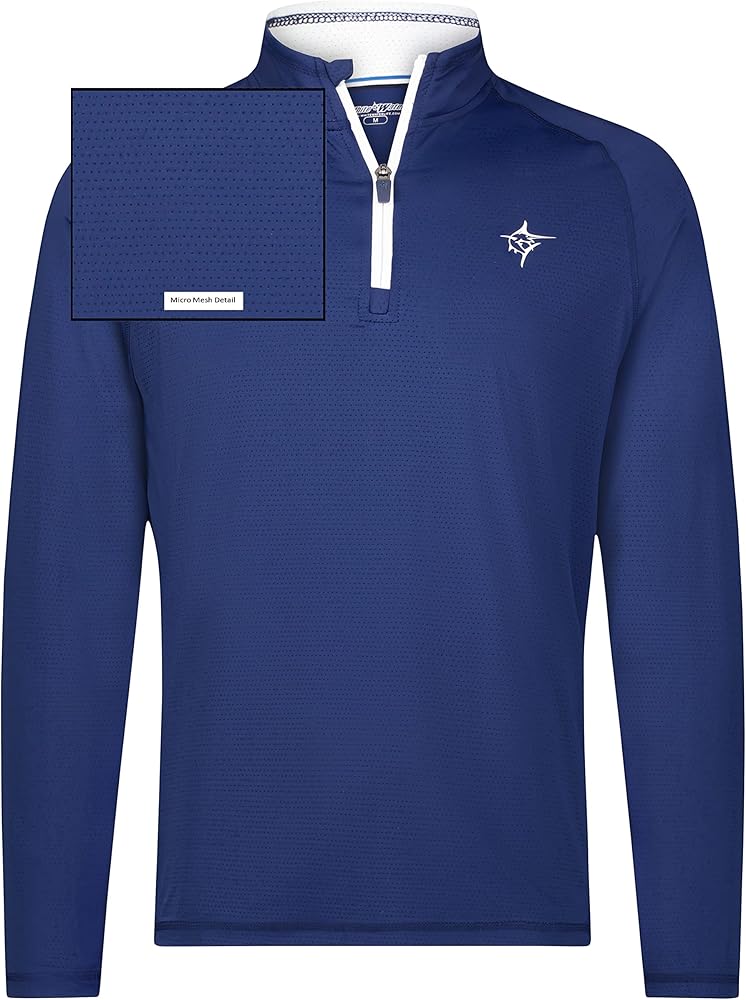 Based on our popular performance 1/4 zip pullovers, we added the Bay Shore in a soft micro mesh fabric. Tiny mesh holes offer 100% ventilation. Perfect piece when you need just a little cover up or when the sun is bright, and you want to keep out of the heat. The Bay Shore is treated with UV50 but does have the mesh fabric which could let in the slightest rays. Silicone logo on left chest