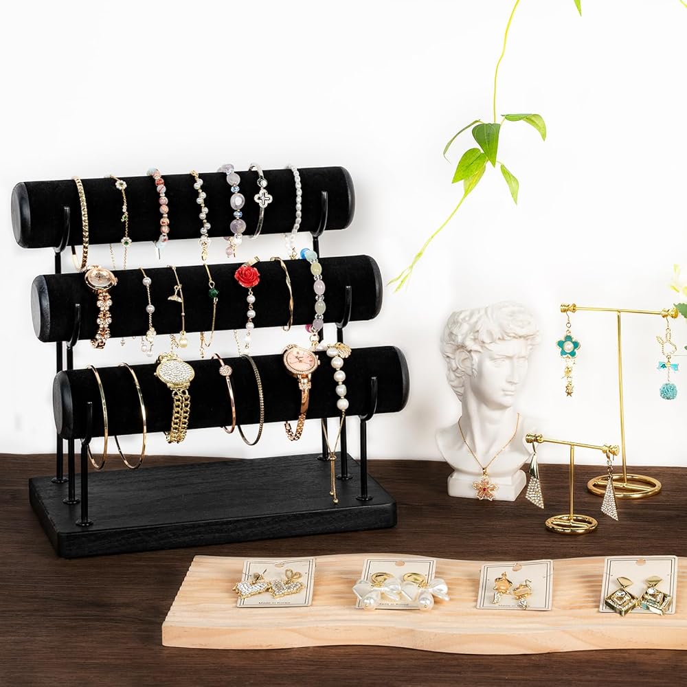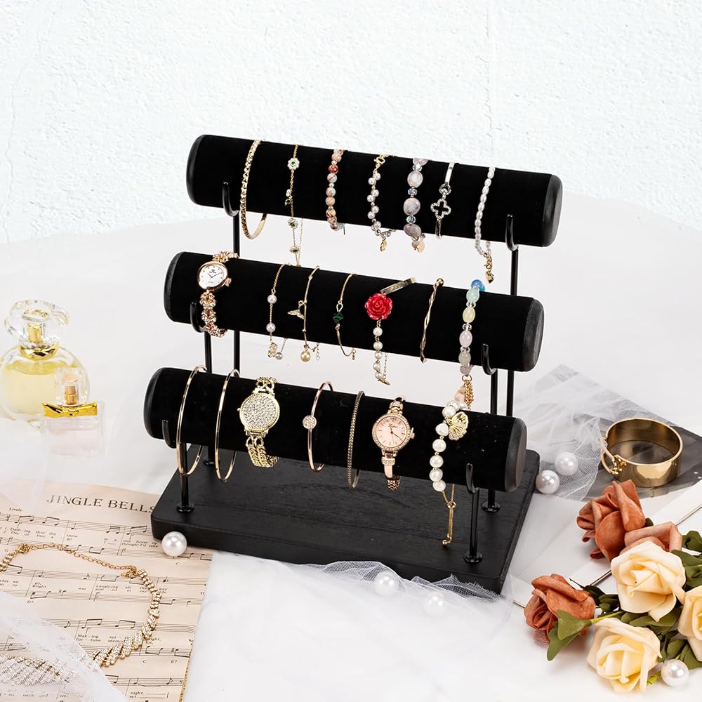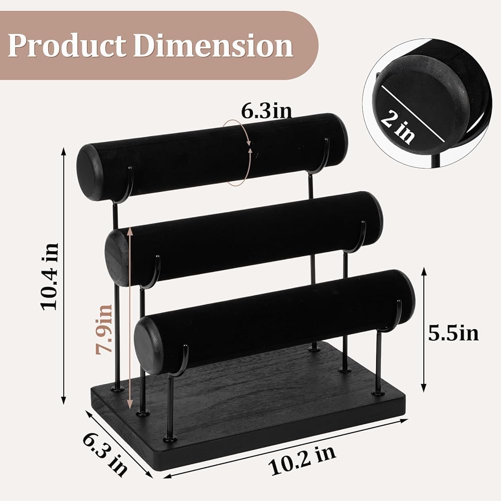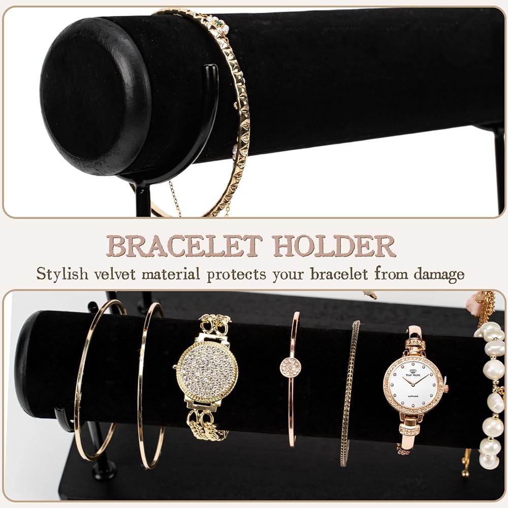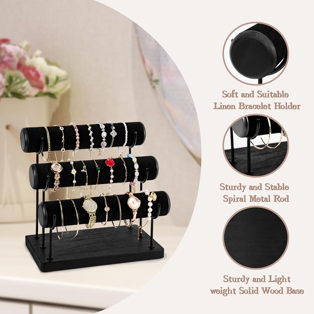 تصميم قابل للفصل: يمكن تفكيكه بالكامل، وهو سهل الحمل للغاية أثناء السفر. 25.4 سم × 25.4 سم × 16.3 سم، مع ثلاثة قضبان، يمكن لكل طبقة حمل 12-20 سوارًا، مثالية لتنظيم الأساور والأساور والساعات وعصابة الرأس على سطح المكتب، ثم عرضها بشكل أنيق، واجعل مجوهراتك الجميلة لا تسبب الفوضى أو التشابك أبدًا. في الدرج.