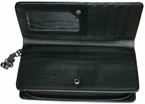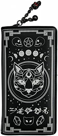 This spooky wallet will make you the envy of the coven! Designed like an ancient spellbook covered in witchy symbolism, one side features a black cat, skulls, and moon phases. The other, an ouroboros, pentagram, crystals, and the theban alphabet. Half of the wallet snaps closed to secure ten credit card slots, one ID window, and three paper money slots. The other half is a large coin pouch with a divider that is secured with a full zipper closure. The zipper has a metal skull charm. Measures approximately 8"x4"x1" and made of vegan leather. Complete the collection with the Spellbinder handbag!