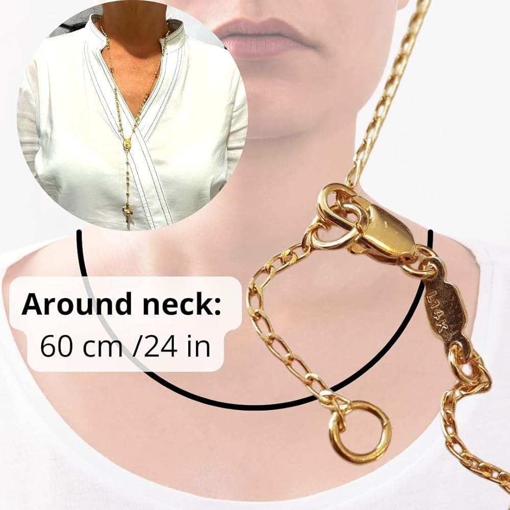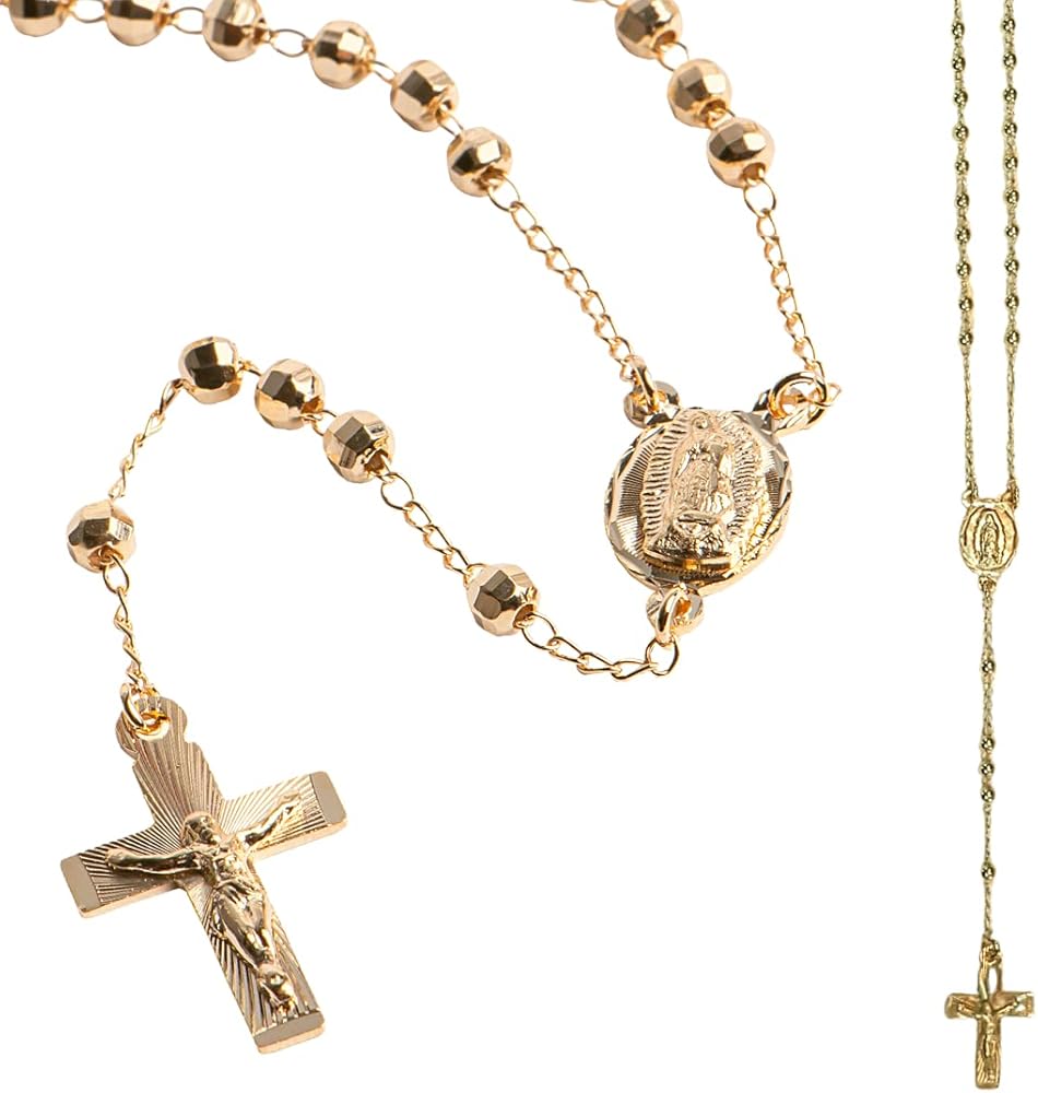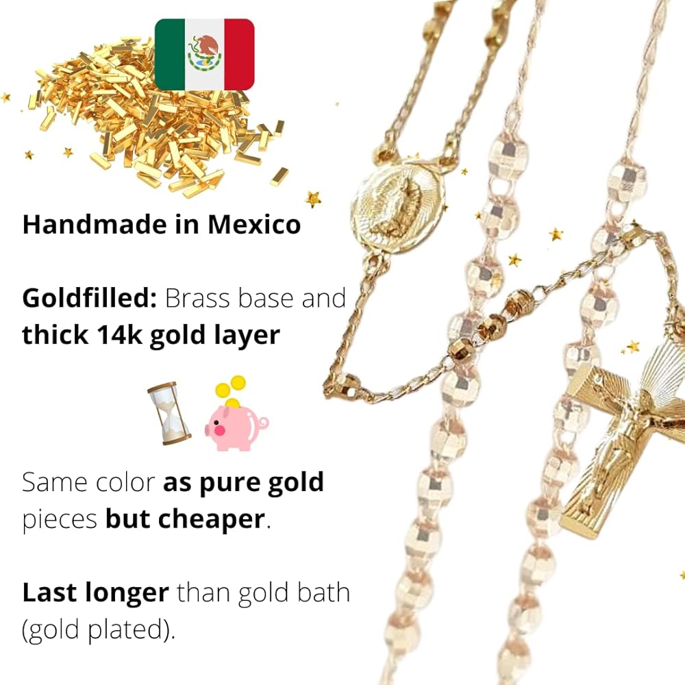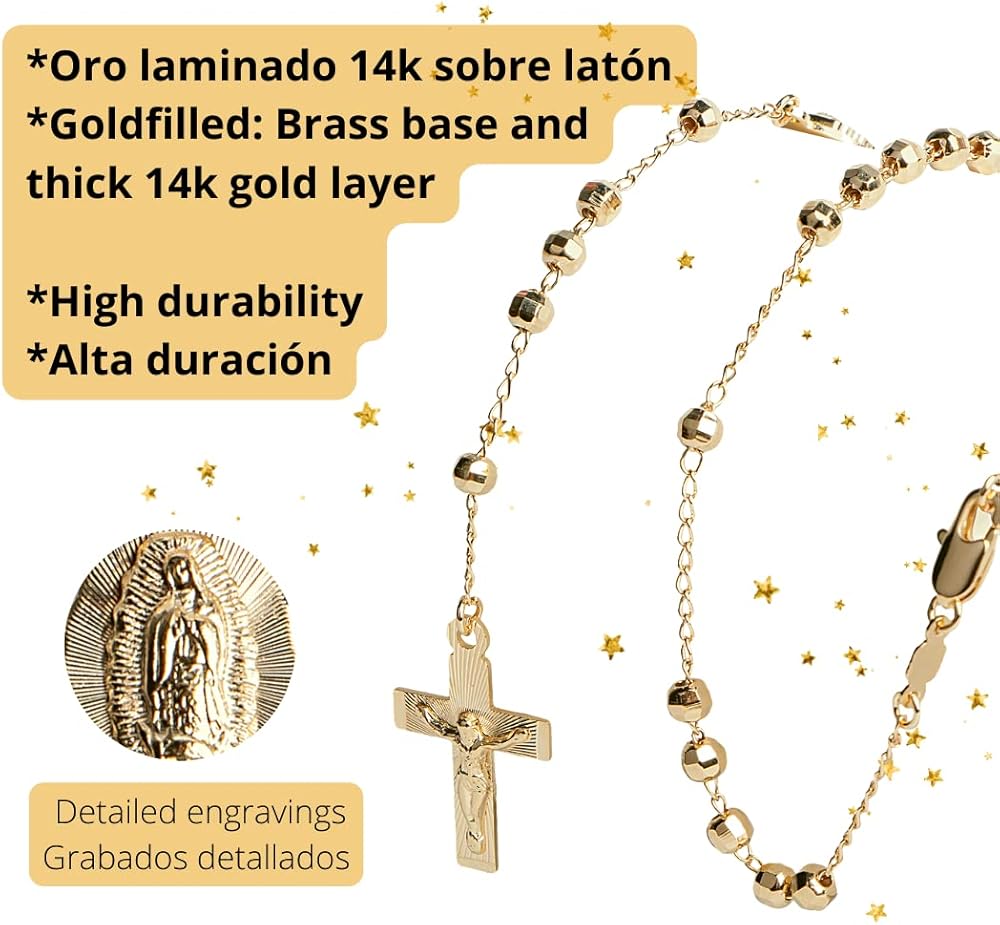 • تدوم لفترة أطول، حتى عقود: سلسلة مسبحة من الذهب البكر من غوادالوبي مصنوعة بالضغط على طبقة تتكون من الذهب عيار 14 قيراط على قاعدة معدنية، لذلك تظل مسبحة الصلاة الذهبية محمية لفترة طويلة، حتى لعقود، لأن اللمسة النهائية الذهبية أكثر سمكًا من الطلاء بالذهب. اللمسة النهائية: 50 إلى 100 مرة أكثر سمكًا من الطلاء الذهبي المطلي العادي.