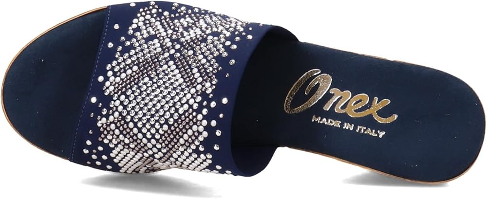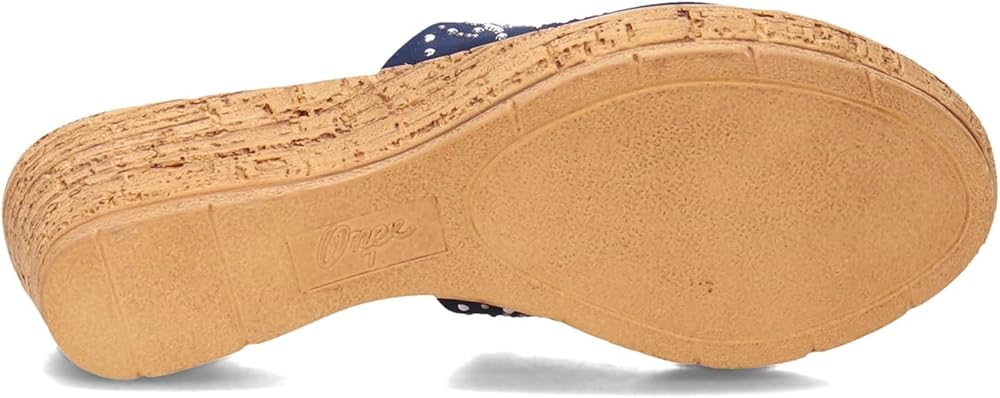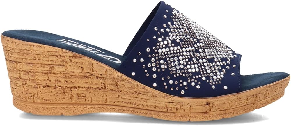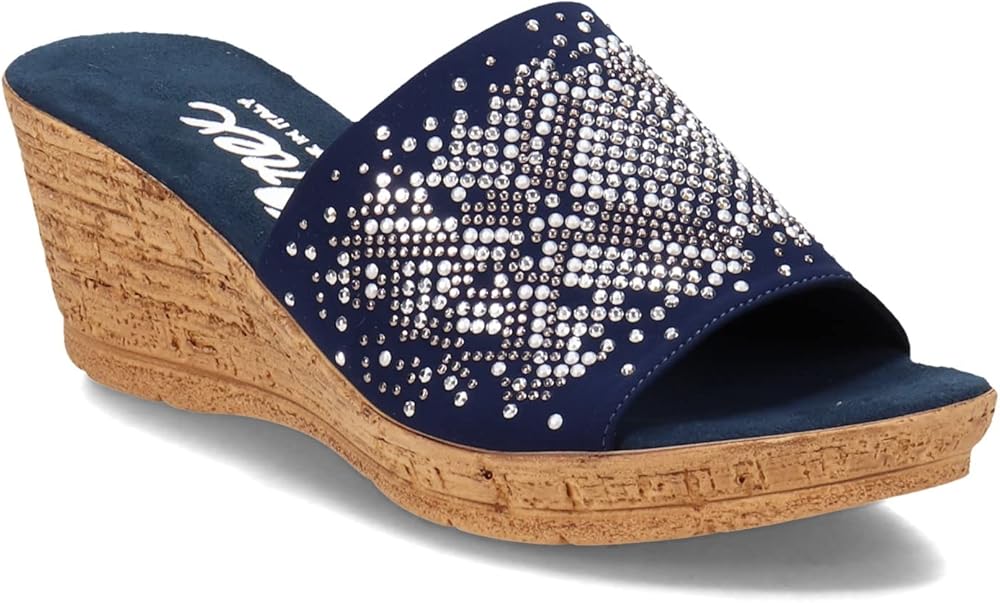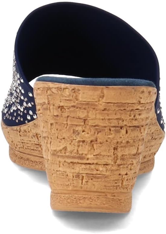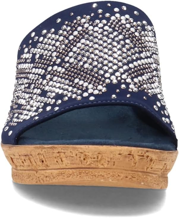 Women's Onex, Joline Sandal. Joline is a beautiful slide sandal with metallic stud accents. A fully cushioned insole, flexible construction and a low wedge make it a comfortable choice for all day wear. This wedge can easily be dressed up or down and is perfect for those summer dresses, skirts and shorts. Super comfortable slide with stretch fabric upper Rhinestone embellishments for a touch of pizazz Fabric linings for cool, breathable comfort Plush sueded cushion footbed Cork print 2 1/4 inch wedge heel with a 3/4 inch platform. Heel Height of 2.25 inches. Platform Height of 0.75 inches.