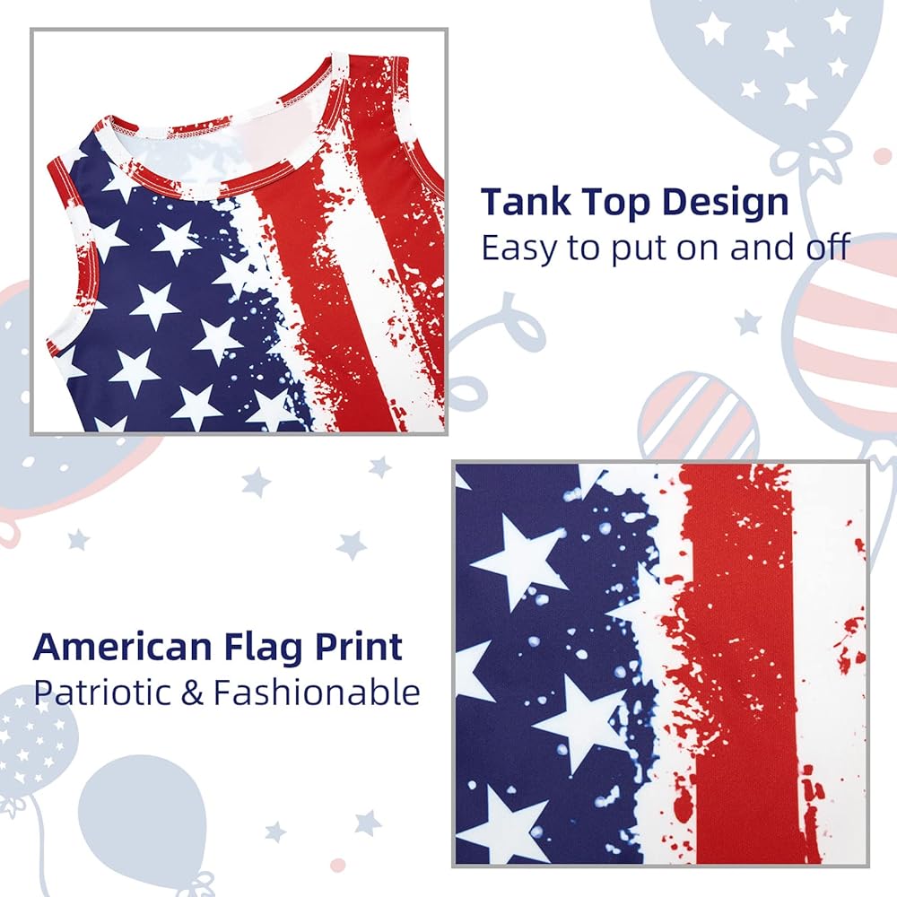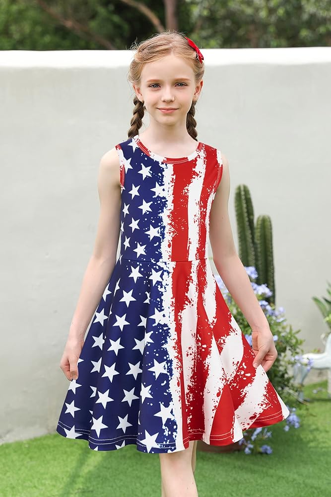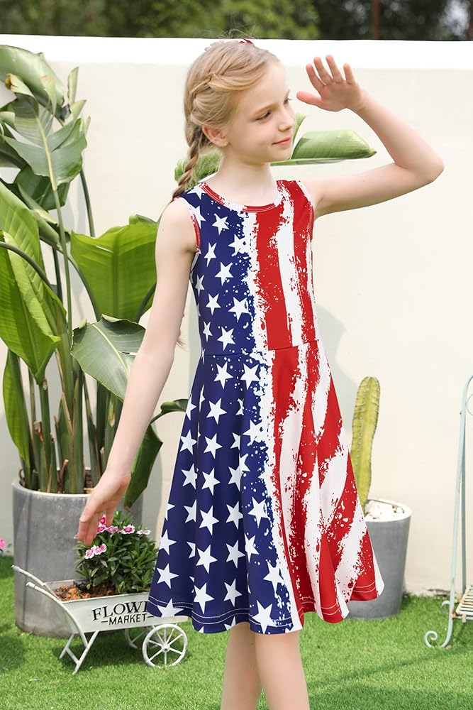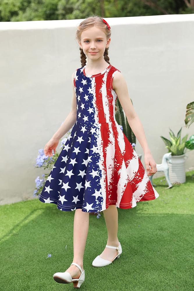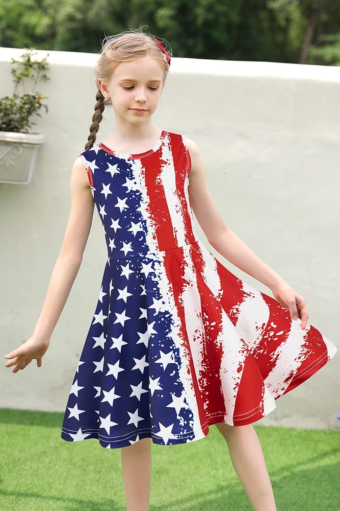 التصميم: فستان الرابع من يوليو للفتيات يتميز بدون أكمام، قميص بدون أكمام، طول الركبة، وحاشية ملفوفة. تضيف طباعة النجوم والخطوط لمسة احتفالية إلى مظهر فتاتك.