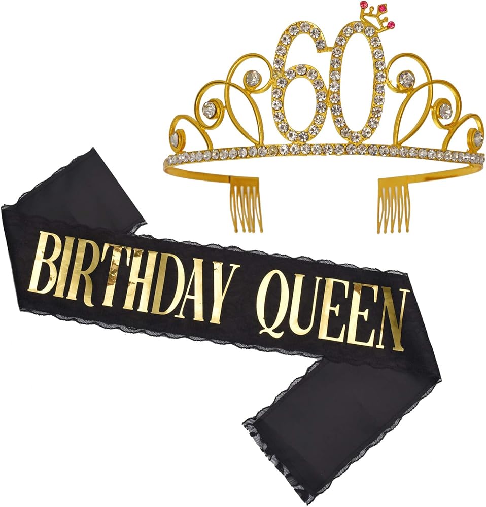 Elegant Charm: Feel like queen on your milestone day! Adorned with sparkling crystals, our tiara and sash set bring unique elegance to your 60th birthday celebration.