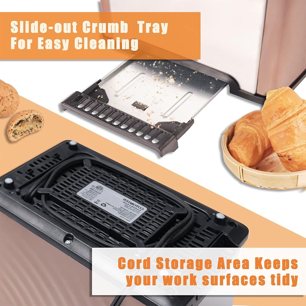 [صينية فتات الخبز القابلة للإزالة وغطاء سلكي مريح] صينية فتات الخبز المنزلقة للخارج، والتي يتم سحبها بسهولة من الجزء السفلي من المحمصة، مخصصة للتنظيف السريع والبسيط للفتات والحطام. تحتوي المحمصة أيضًا على غلاف سلكي لإدارة أسلاك الطاقة بشكل غير مرئي عندما تحتاج إلى تخزينها.