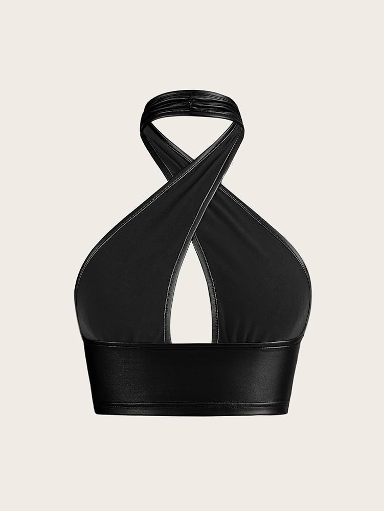 • التصميم: جلد البولي يوريثان، بدون أكمام، بدون ظهر، متقاطع، مقصوص، رقبة على شكل رسن