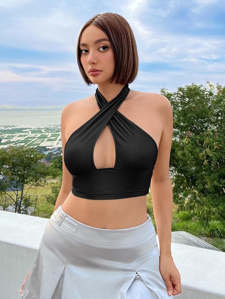 بلوزة قصيرة للسيدات من OYOANGLE للحفلات متقاطعة متقاطعة بدون أكمام، بلوزة قصيرة للنادي