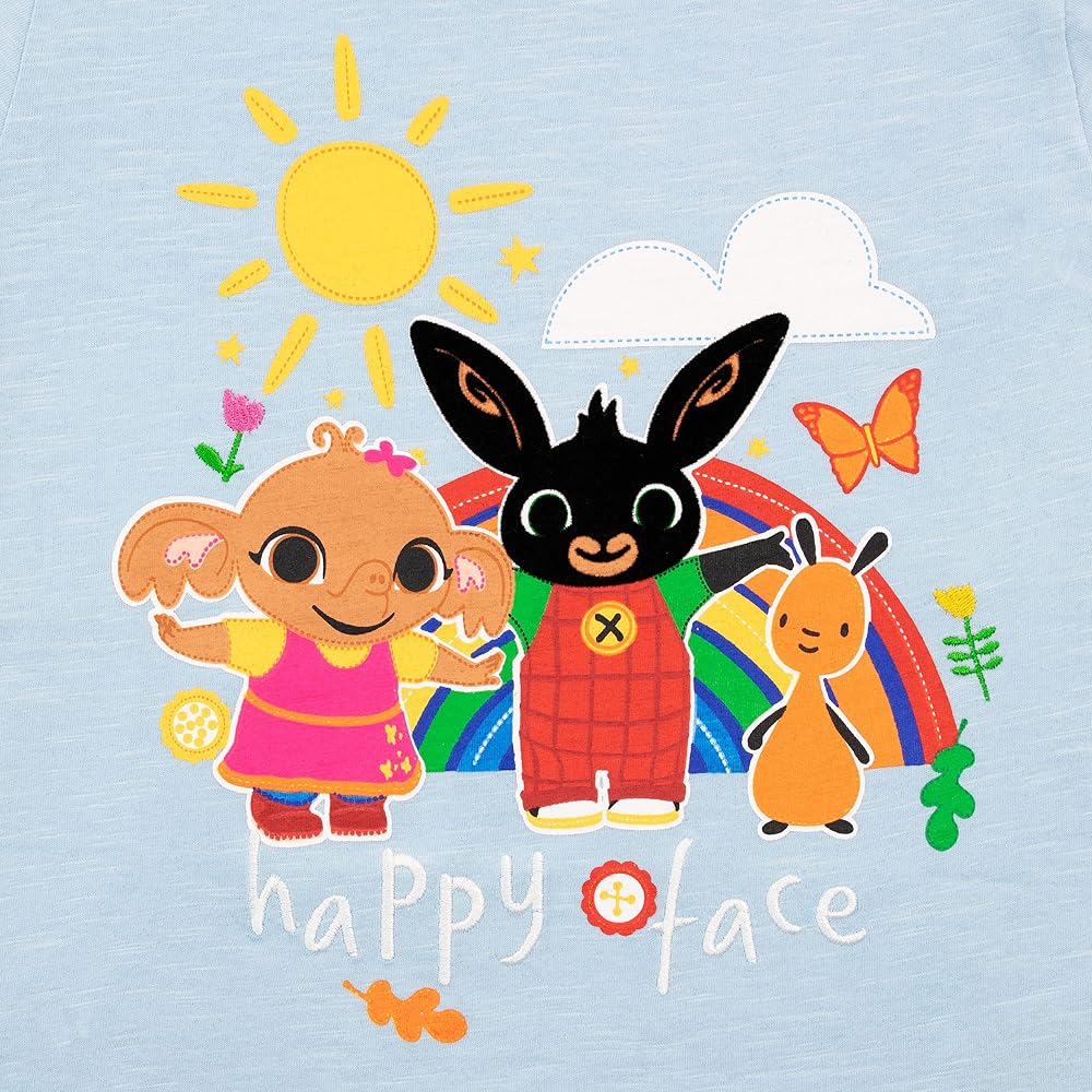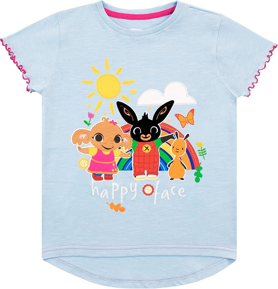 Girls Bing t-shirt. Surprise your little one with this adorable tee perfect for adventures with Flop and Suly! This pretty blue short sleeve top features a super soft faux print of Cbeebies bunny Bing with Suly and Flop. Surrounded by embroidered prints of a rainbow, sunshine, flowers and butterflies this tshirt is perfect for the summer and playtime! Finished with lovely frilly sleeves, your little bingsta will be happy to hop straight out of bed and into this!