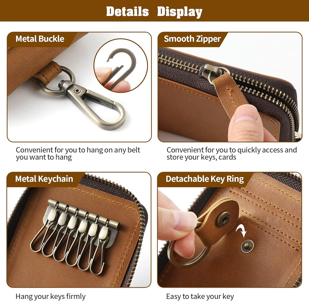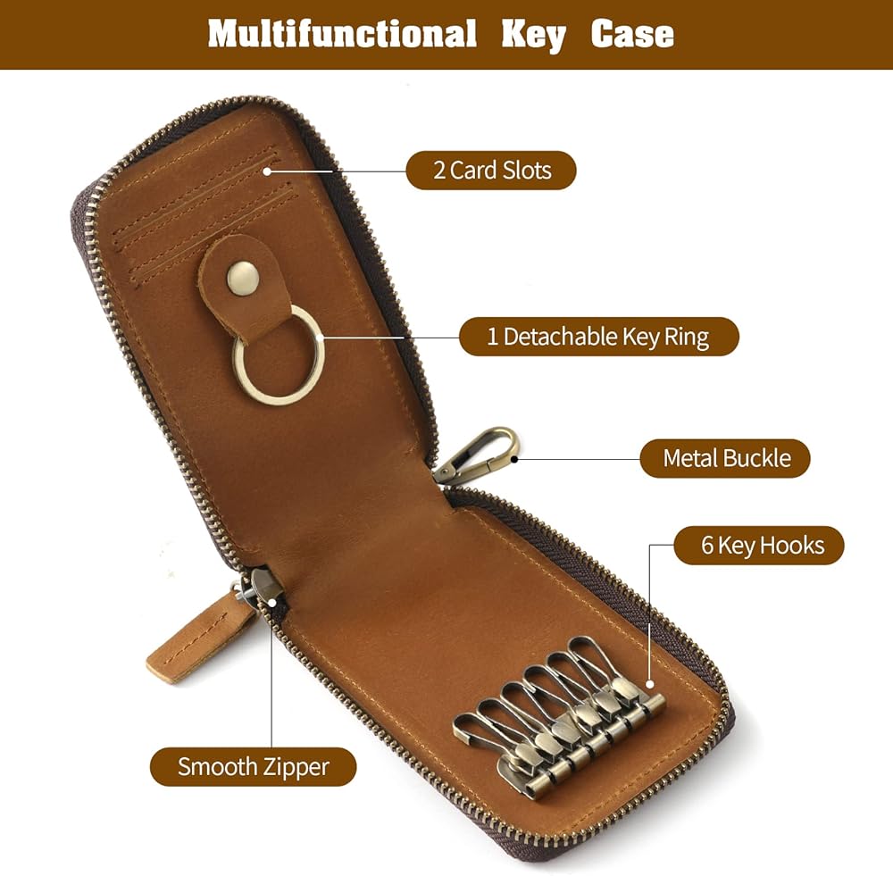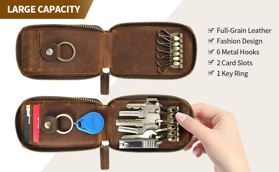 غطاء مفتاح متعدد الوظائف: توجد فتحتان للبطاقات سهلة الوصول في محفظة حامل المفاتيح، والتي تستخدم لتخزين البطاقات الأكثر استخدامًا لتلبية استخدامك اليومي. 6 خطافات للمفاتيح، قم بتخزين مفاتيحك بشكل معقول. 1 مشبك حلقي، والذي سيكون مثاليًا للاستخدام كحلقة مفاتيح السيارة.