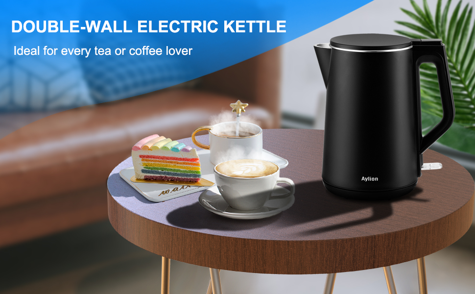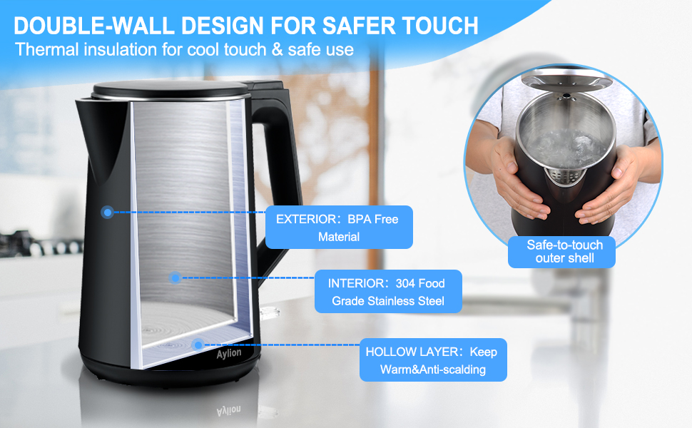 لمسة رائعة مع هيكل جدار مزدوج: مع تصميم الجدار المزدوج، يبقى جسم الغلاية الكهربائية ومقبض غير قابل للانزلاق باردًا عند اللمس بينما يغلي الماء بسرعة. أكثر أمانا لكبار السن والأطفال. حافظ على الماء دافئًا لفترات أطول من الوقت.