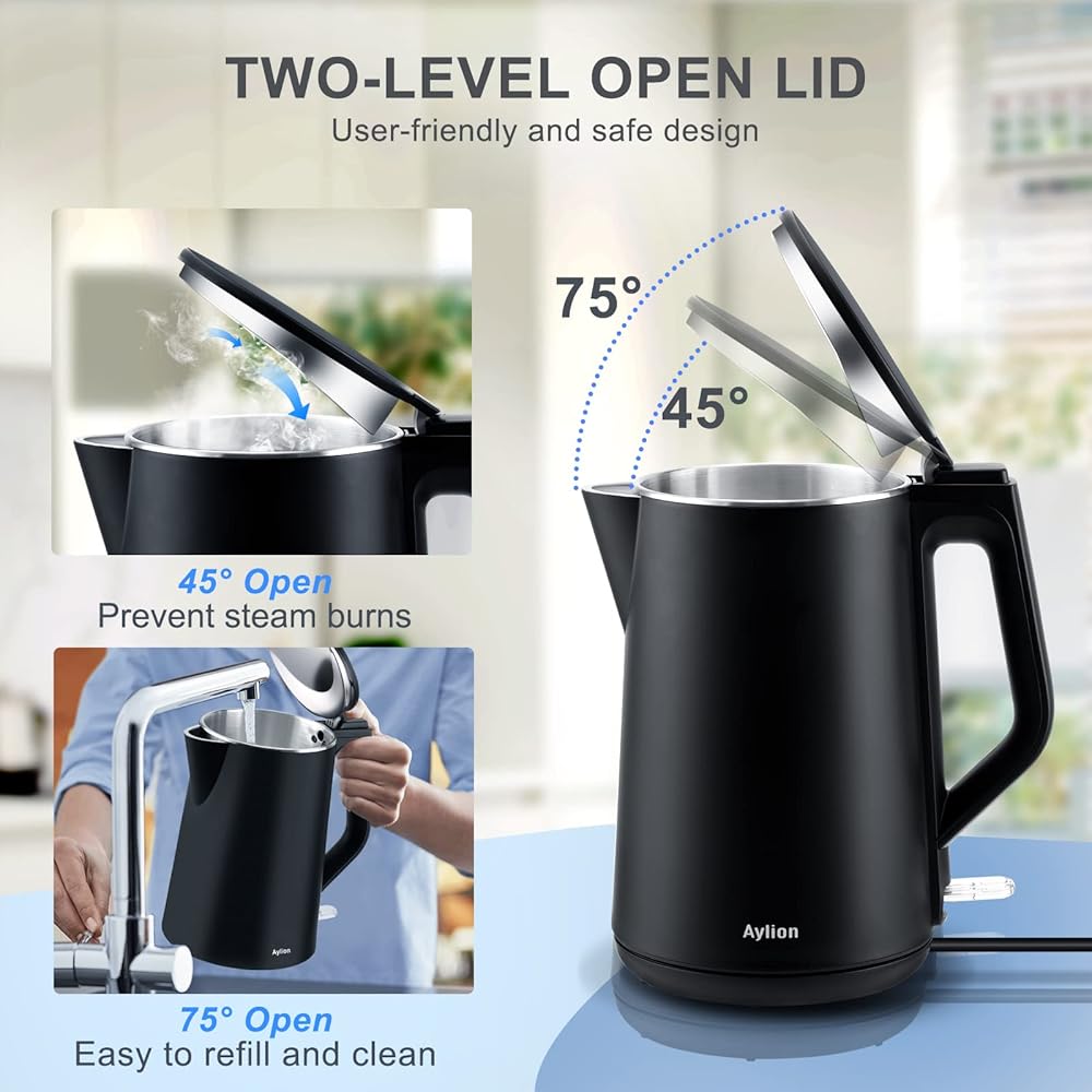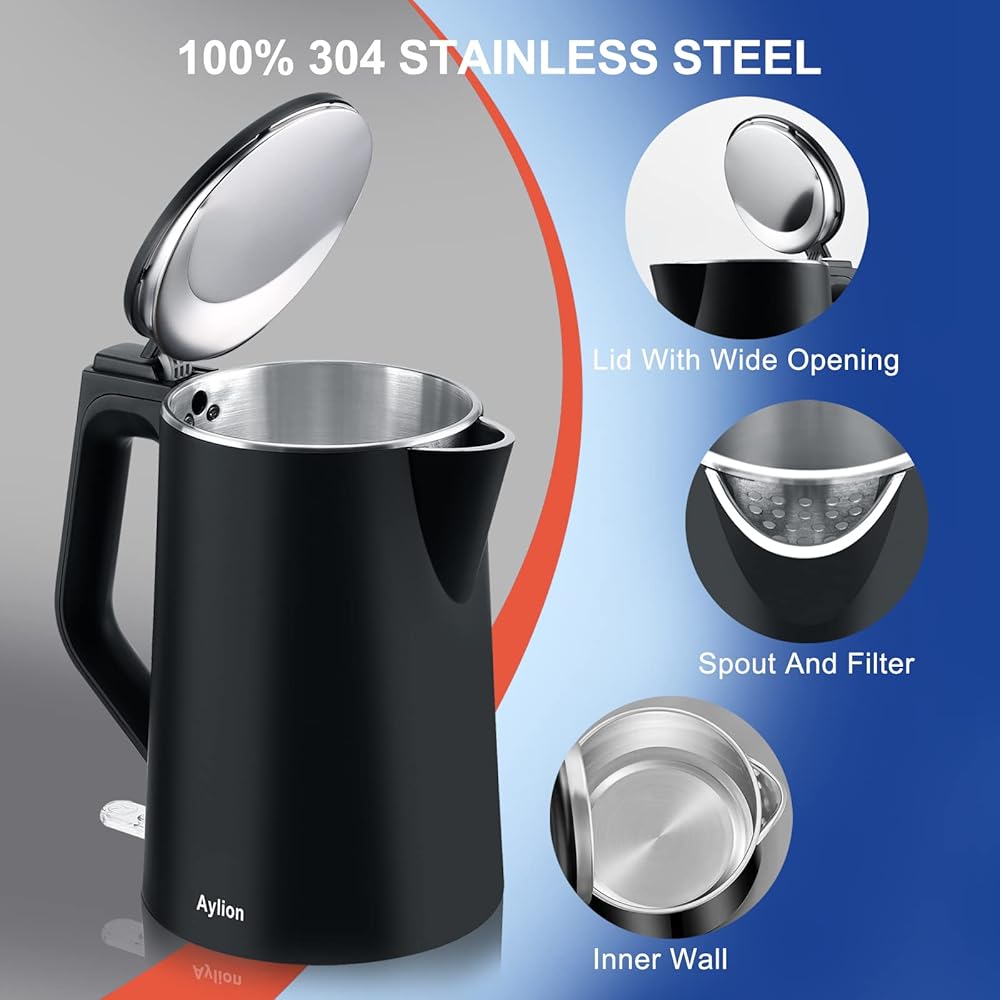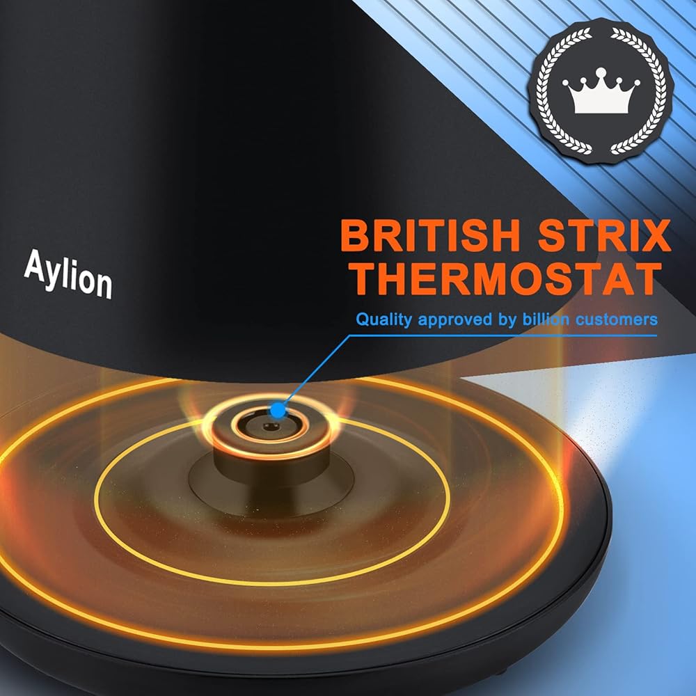تسخين سريع وهادئ بقدرة 1500 واط: تتمتع غلاية Aylion بقدرة 1500 واط تعمل على تسخين 1.5 لتر من الماء في 5 دقائق بسرعة وبهدوء. علاوة على ذلك، يمكنك معرفة متى تصبح المياه جاهزة تمامًا باستخدام مؤشر LED باللون الأحمر. توفير وقتك والعمل بشكل أكثر كفاءة.