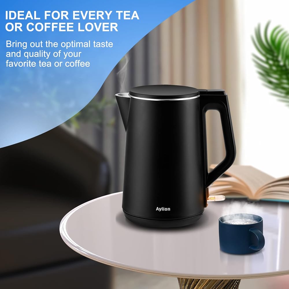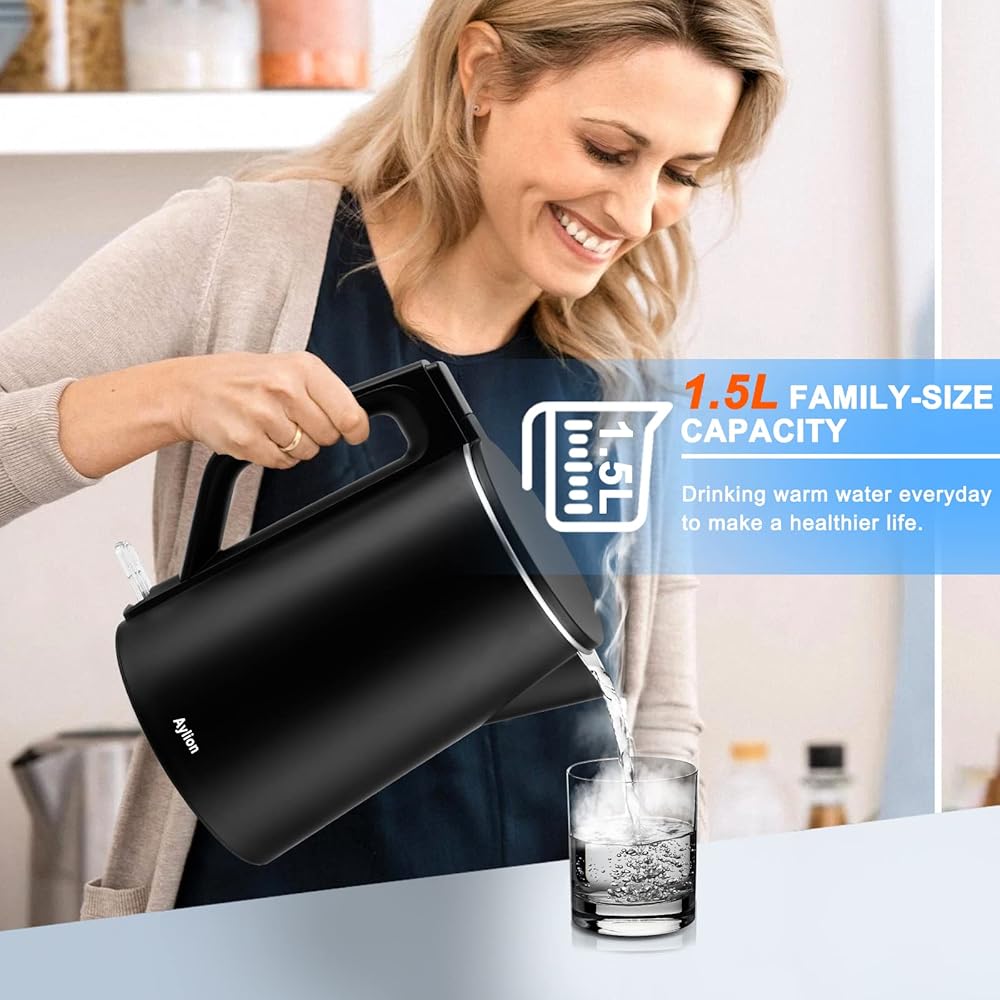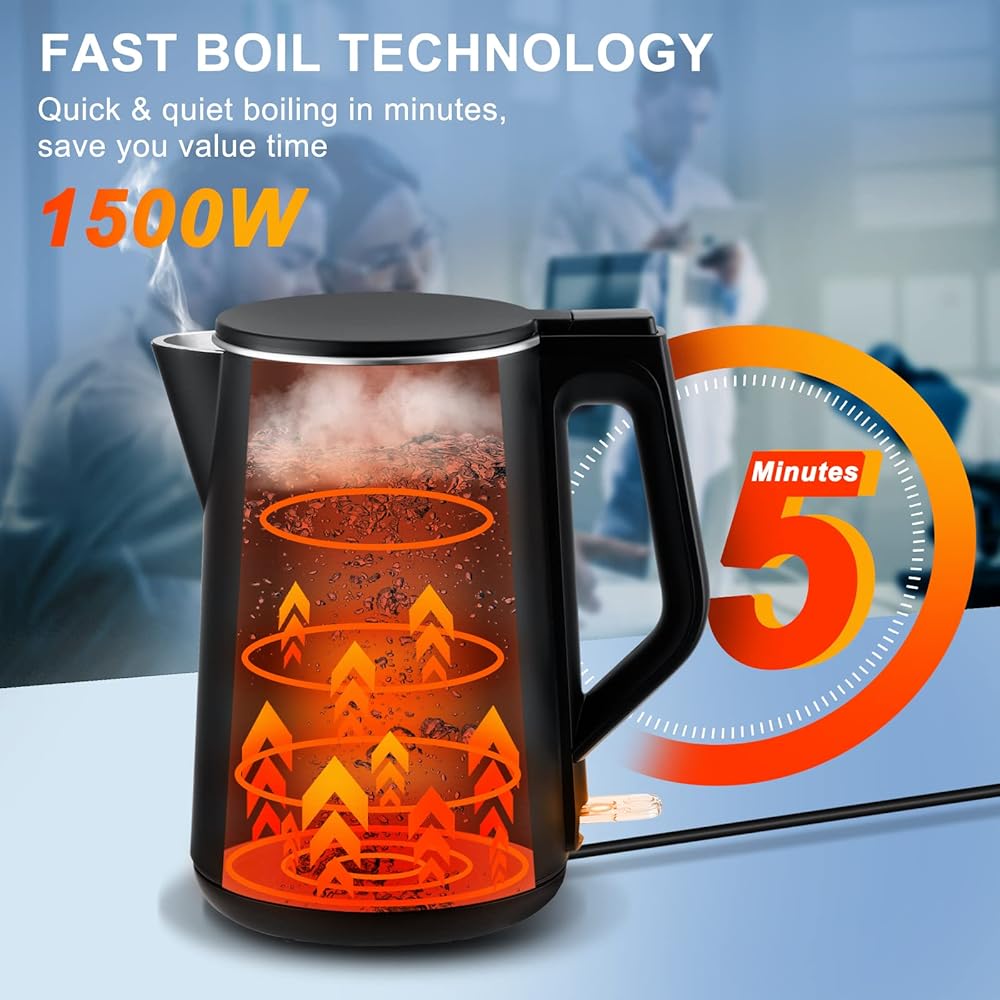 غلاية كهربائية، غلاية شاي كهربائية بجدار داخلي مزدوج من الفولاذ المقاوم للصدأ بنسبة 100%، غلاية مياه ذات ملمس بارد بقدرة 1500 وات، سعة 1.5 لتر، خالية من مادة BPA مع إيقاف تلقائي وحماية من الغليان الجاف، قاعدة لاسلكية ومؤشر LED