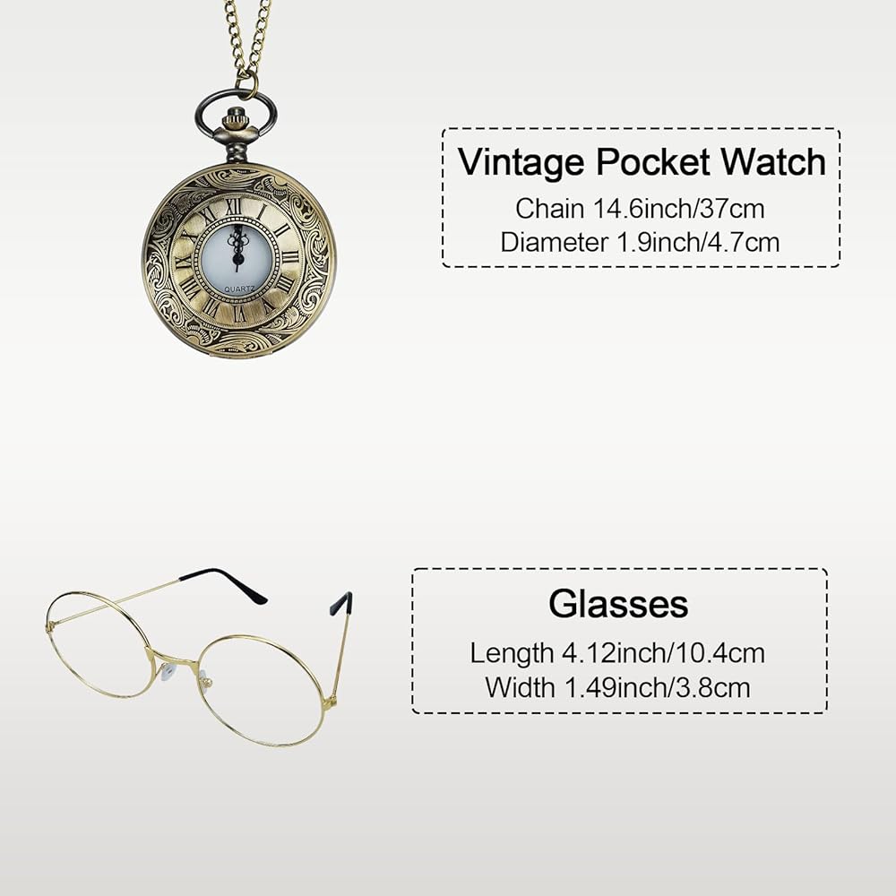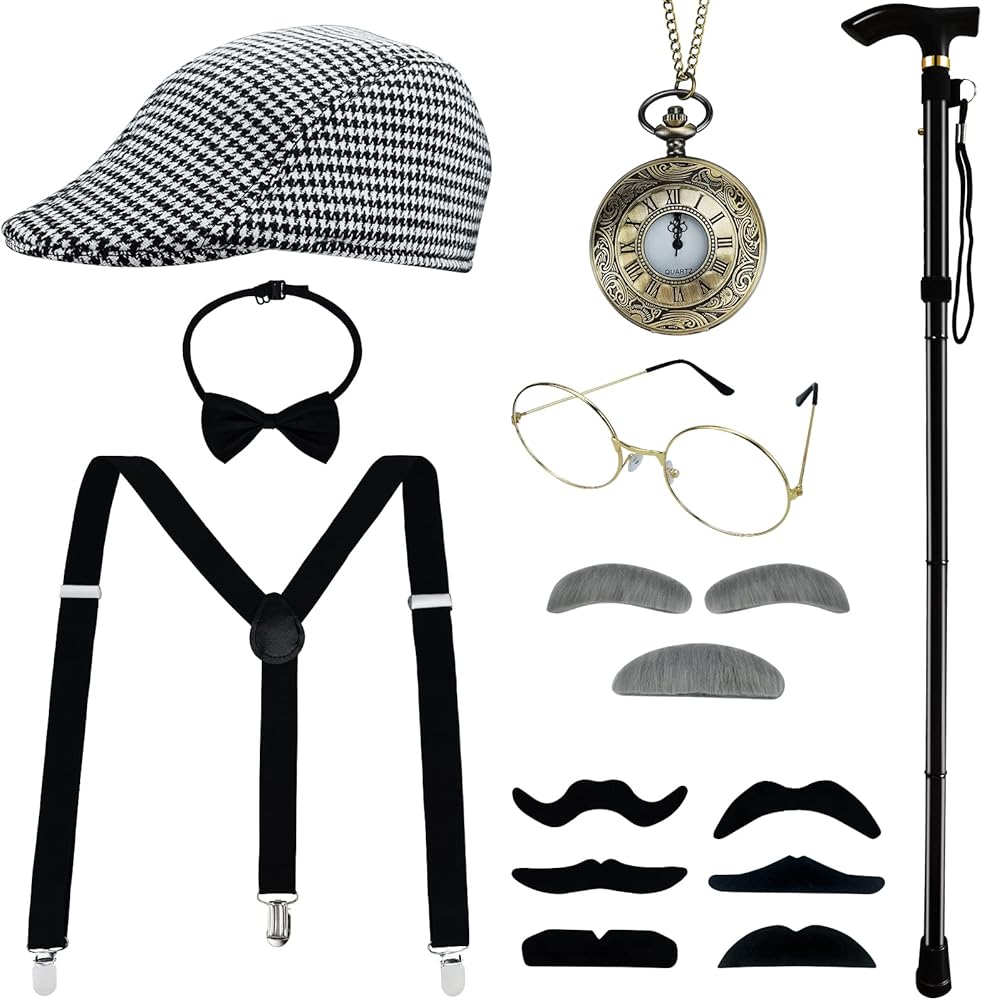 • إكسسوارات مثالية: سوف تحصل على قطعة واحدة من قبعة بيريه، وزوج واحد من النظارات، وقطعة واحدة من الشارب الرمادي ومجموعة حواجب على شكل أرنب، وقطعة واحدة من الساعة (بدون بطارية، لا تعمل فعليًا)، وقطعة واحدة من العصا، وقطعة واحدة من حمالة مرنة على شكل حرف Y، ربطة عنق على شكل فيونكة. مجموعة من إكسسوارات الملابس العتيقة ستجعلك تبدو كرجل عجوز.