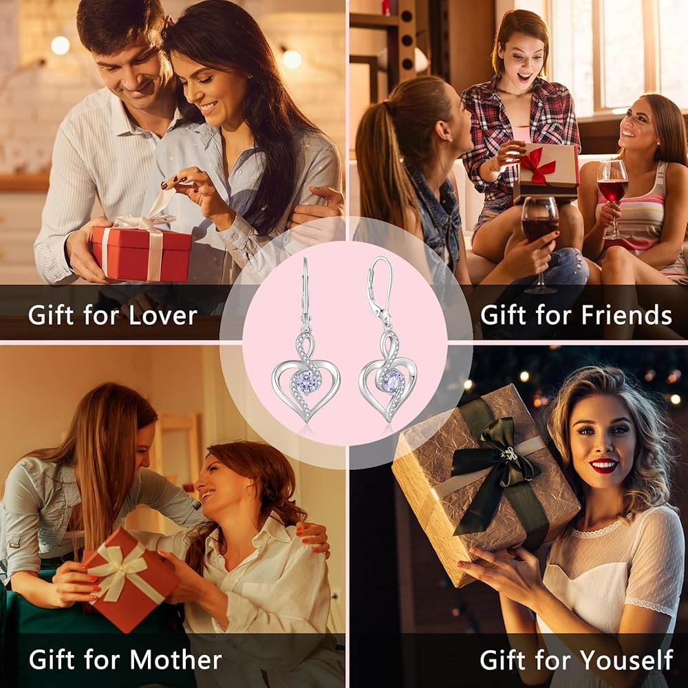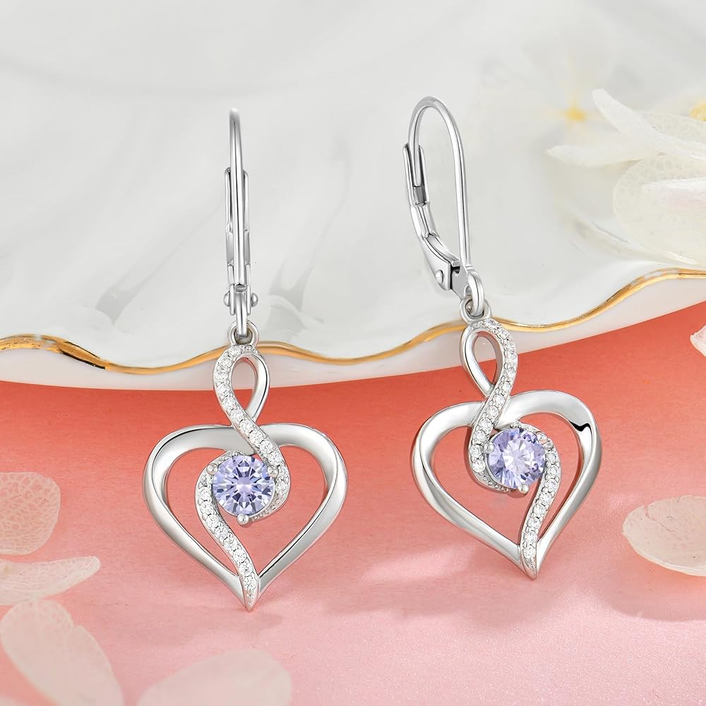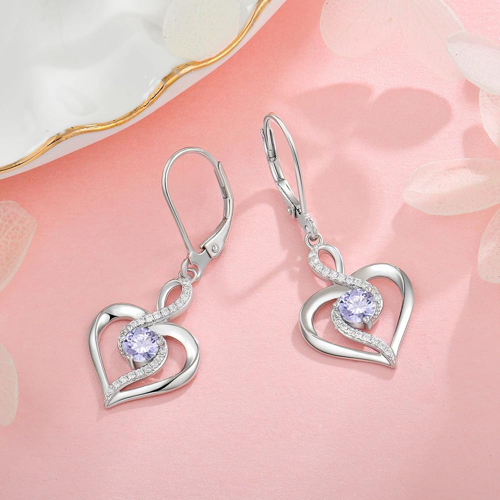 Oskani Heart Birthstone Dangle Earrings for Women, 925 Strlings Silver 5A Cubic Zircon Leveback Earrings Jewelry Birthday Gifts for Her