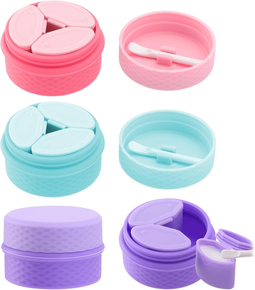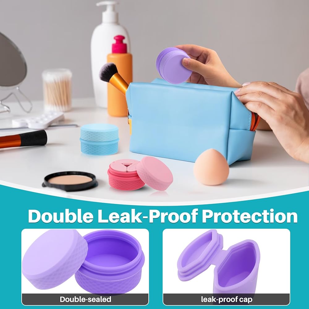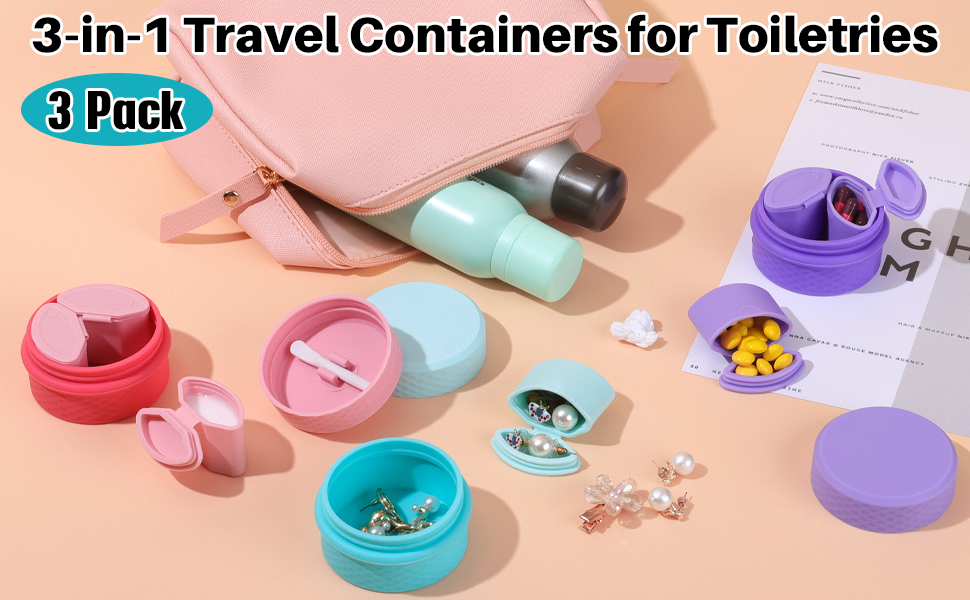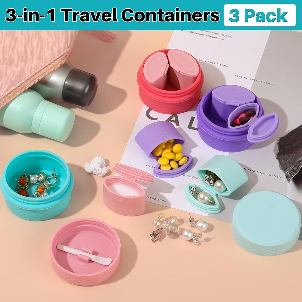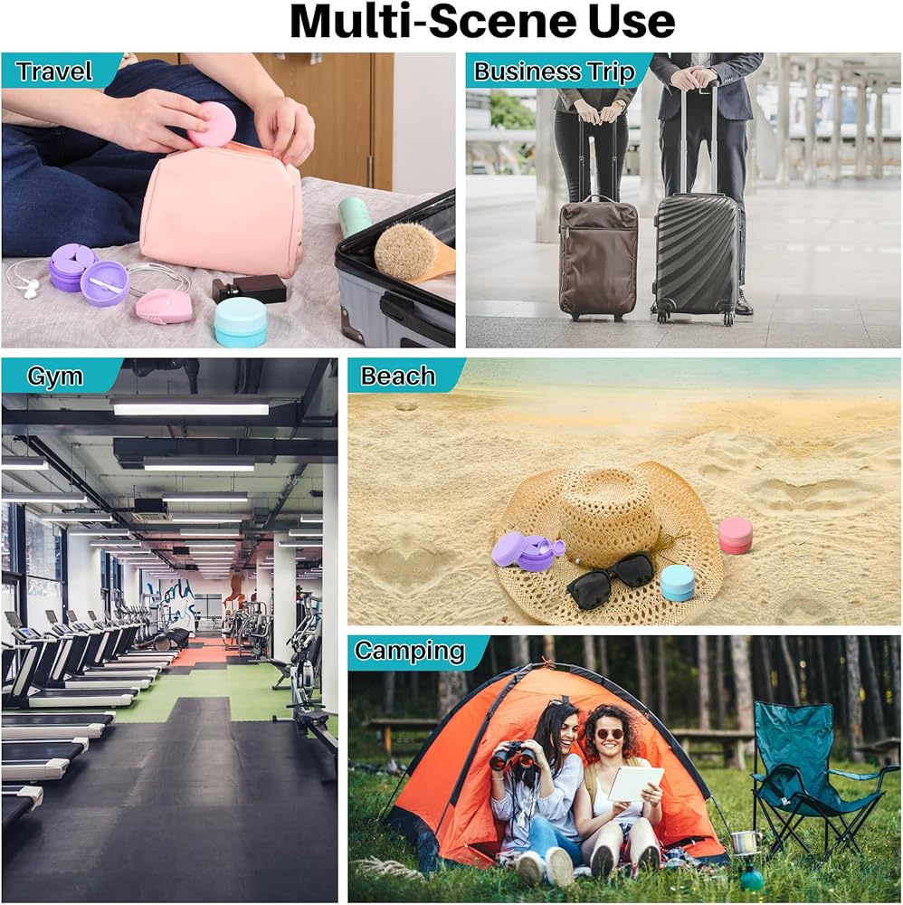 【تصميم عصري فريد】تأتي مع 3 مجموعات من حاويات السفر المصنوعة من السيليكون - لا غنى عنها في سفرك! تحتوي كل مجموعة على 3 برطمانات صغيرة مع أغطية لتعبئة مستحضرات التجميل المختلفة أو أدوات النظافة أو الحبوب أو المجوهرات الثمينة. صغيرة الحجم وخفيفة الوزن، يمكن وضعها بسهولة في حقيبة اليد أو حقيبة المكياج، مثالية للسفر في عطلة نهاية الأسبوع أو عطلة الشاطئ أو رحلة العمل لمسافات قصيرة.
