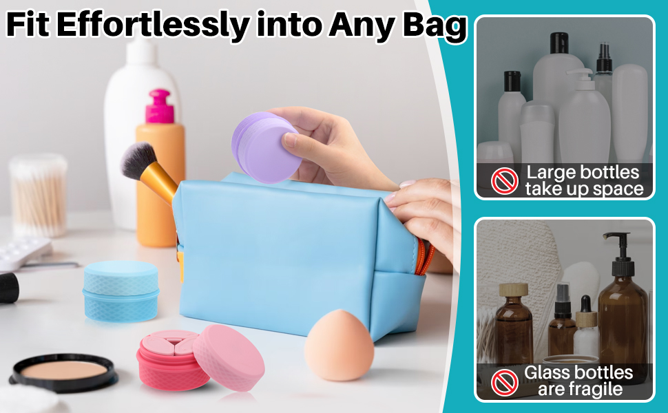 【حماية مزدوجة ضد التسرب】يحتوي كل موزع صغير وحاوية كبيرة على غطاء مزدوج الغلق مانع للتسرب يضمن إغلاقًا قويًا ومحكمًا. لا داعي للقلق بشأن تلطيخ محتويات حقيبتك أو أن تتأكسد أدوات التجميل الخاصة بك وتتحللها.