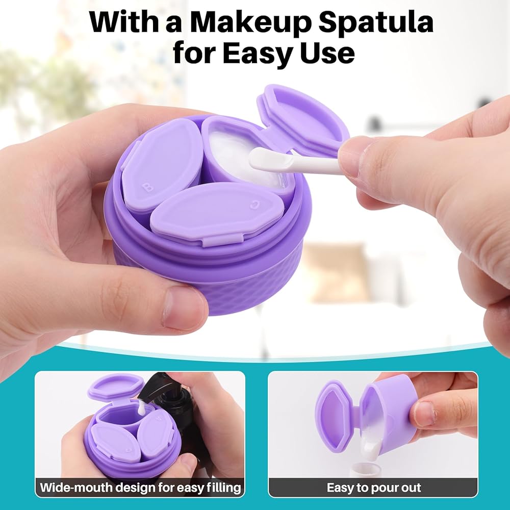 【تصميم مساحة تخزين صغيرة 3 في 1】تأتي مع زجاجات أدوات الزينة المعتمدة من إدارة أمن المواصلات الأمريكية باللون الوردي والأرجواني والأزرق. يوجد 3 موزعات صغيرة منفصلة (حوالي 12 مل) في حاوية تخزين كبيرة (حوالي 82 مل)، والتي تحمل علامة A وB وC لسهولة التعرف عليها. حتى أنها تأتي مع ملعقة صغيرة للمكياج من أجل الراحة. تصميم بفتحة واسعة لسهولة التعبئة - فقط تذكر عدم الإفراط في التعبئة.