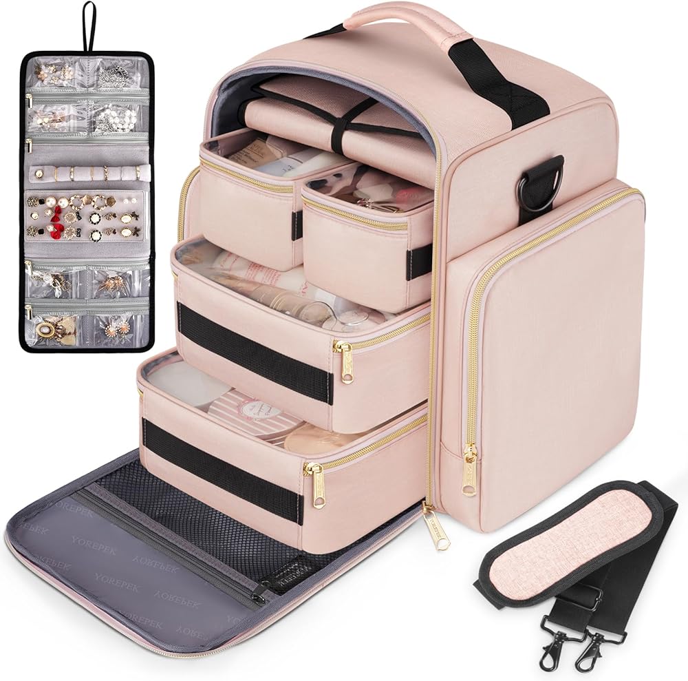 يوربيك شنطة تنظيم مكياج كبيرة للسفر مع 4 حافظات قابلة للازالة ولفة واحدة لتنظيم المجوهرات، شنطة مستحضرات تجميل بجيوب تخزين متعددة لحمل ادوات النظافة والعناية بالبشرة ومستلزمات الشعر والفرشاة، هدية