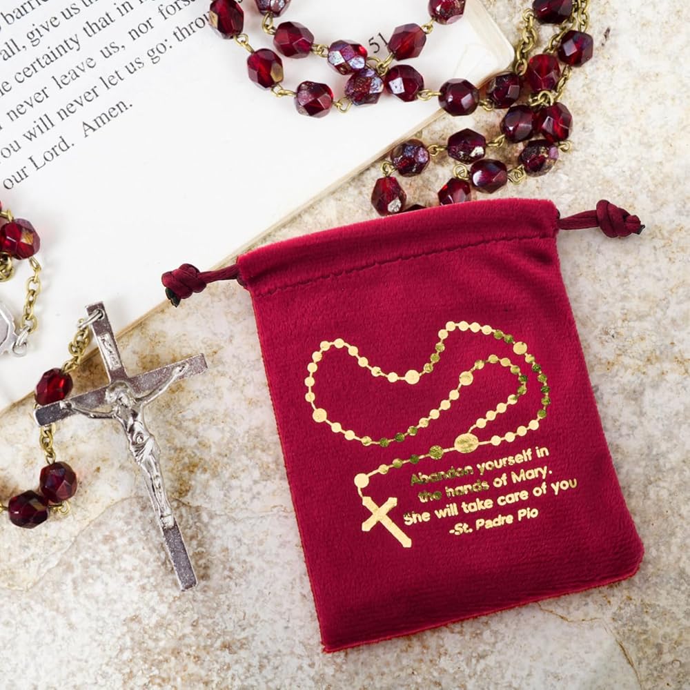 Gold foil embossed: these velvet bags are embossed with golden foil catholic words and rosary pattern; the elegant artwork adds a unique touch to the rosary holder, making it a meaningful accessory