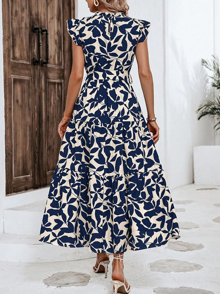 - السمات: زخرفة مكشكشة، حزام أمامي، ياقة واقفة، أكمام قصيرة، خط، خصر مرتفع، حاشية من طبقات، طباعة زهور، فستان طويل للنساء