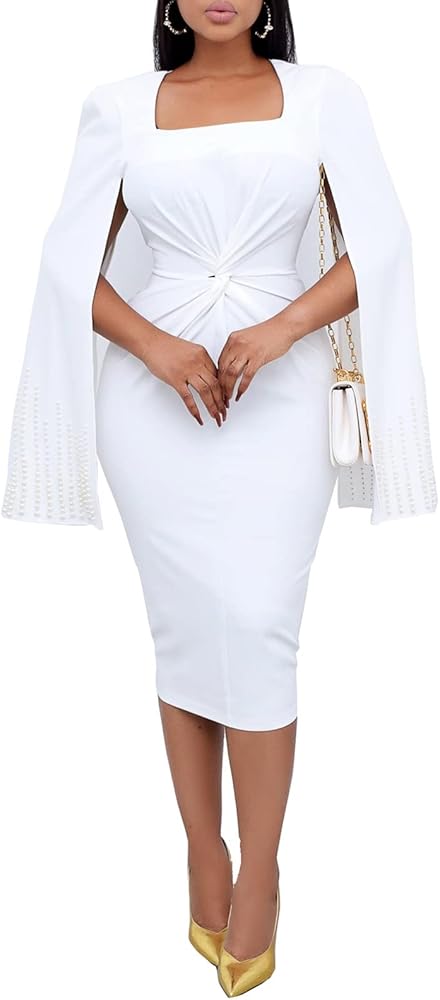 سترة كاجوال سادة برقبة مربعة وأكمام واسعة ملتوية من الأمام بطول الركبة فستان طويل متوسط الطول للنساء