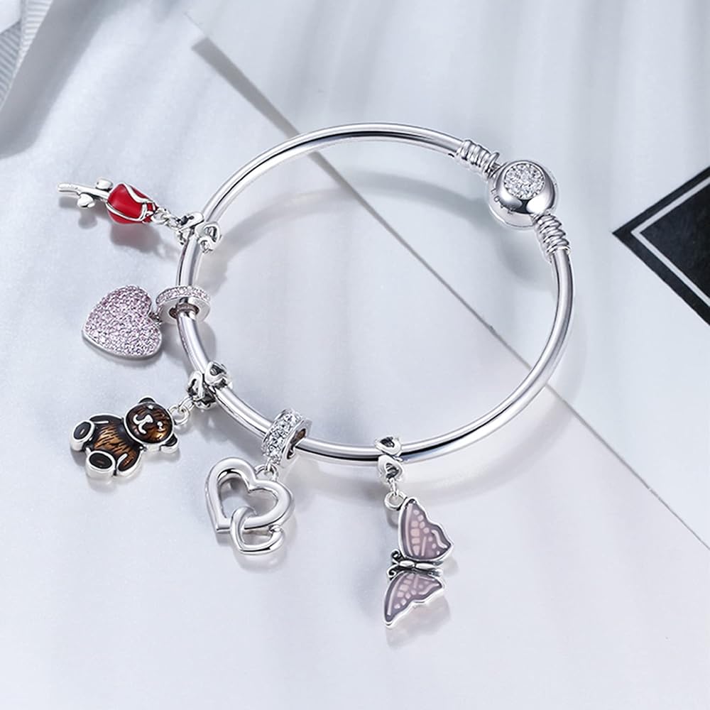 زيون دلاية على شكل فراشة طائرة، حشرات فراشة من الفضة الاسترليني عيار 925 مع قلب حب، خرز على شكل حيوانات من المينا الزهري تناسب قلادة سوار باندورا، هدايا عيد الحب للنساء