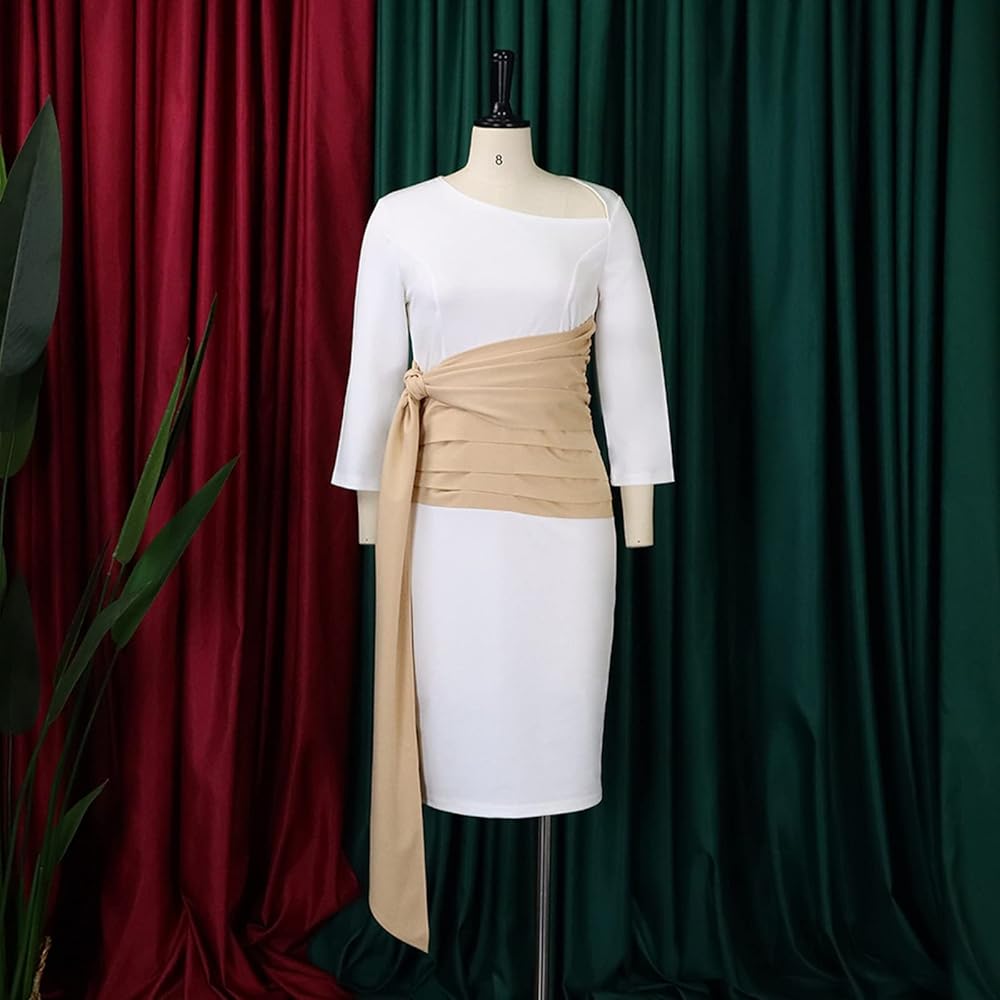 السمات: كشكش على الجانب يغطي خط الجسم ليبدو أنحف، خصر عالي، جسم مثير، كشكشة جانبية، مرقع، فستان بينيكل للأعمال، فستان متوسط الطول، الجزء المطوي على الخصر سوف يتدلى قليلاً إذا كان الجزء العلوي من الجسم رقيقًا .