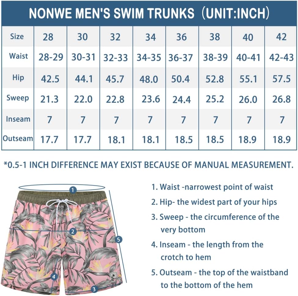 الطول والمناسبات: سروال السباحة مقاس 7 بوصات من طراز هاواي يناسب فوق ركبتك، ويبلغ الطول حوالي 17.7 بوصة - 18.9 بوصة. مثالي للسباحة وركوب الأمواج والرياضات المائية وغيرها من الأنشطة الداخلية والخارجية. يرجى اتباع جدول المقاسات للتأكد من المقاس قمت بالشراء.