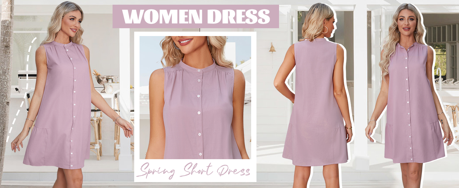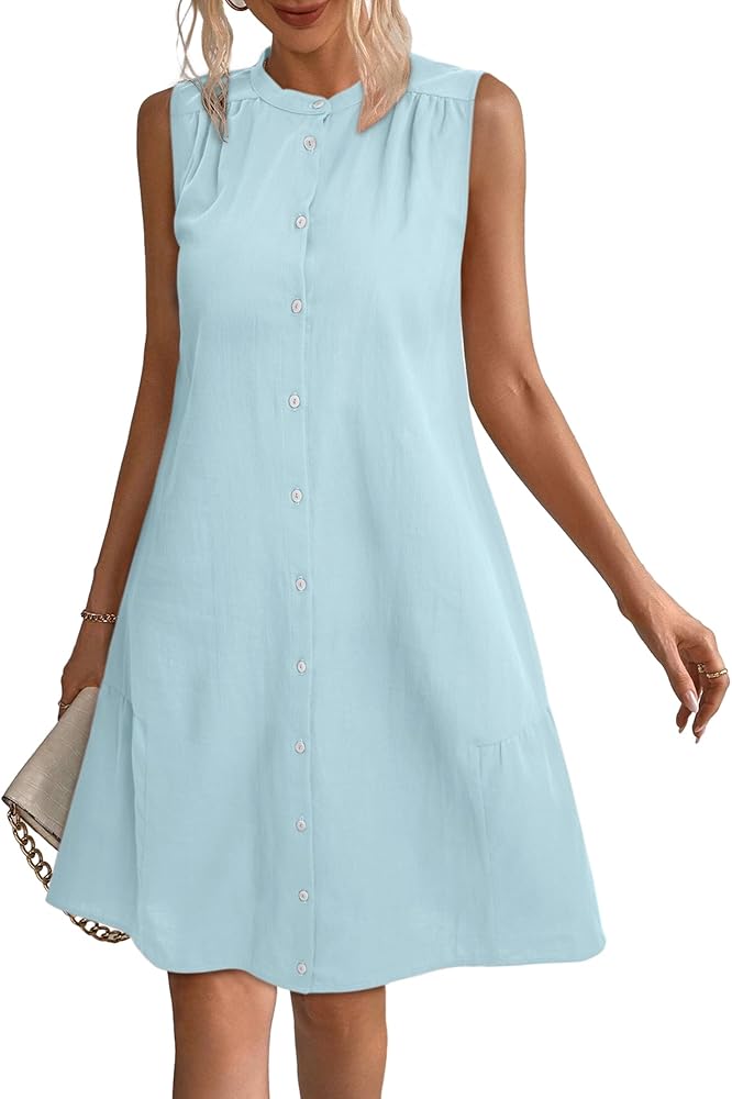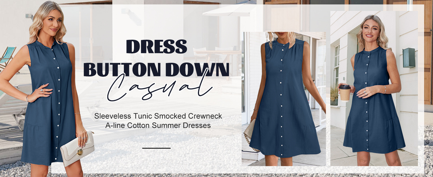 【تصميم أنيق】فساتين شمس كاجوال، بدون أكمام، رقبة دائرية، أزرار سفلية، وتصميمات مطوية حول الرقبة والحاشية. فستان الشمس هذا فوق الركبتين وطويل بما يكفي لارتدائه بدون سروال. القصة العادية على شكل حرف A تُبرز منحنياتك بشكل جميل، مما يجعلك مبهرًا طوال الموسم.